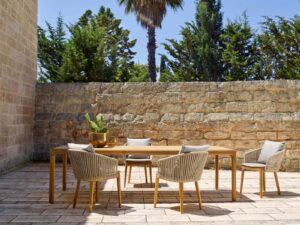 Teakholz spielt dabei eine wichtige Rolle. Dieses edle Naturmaterial überzeugt durch seine natürliche Widerstandsfähigkeit gegenüber Feuchtigkeit und Temperaturschwankungen. Gleichzeitig bringt es Wärme und Charakter in Ihren Aussenraum. Mit der Zeit entwickelt Teak eine silbergraue Patina, die den Möbeln eine elegante, lebendige Oberfläche verleiht.