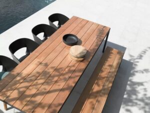 Teakholz spielt dabei eine wichtige Rolle. Dieses edle Naturmaterial überzeugt durch seine natürliche Widerstandsfähigkeit gegenüber Feuchtigkeit und Temperaturschwankungen. Gleichzeitig bringt es Wärme und Charakter in Ihren Aussenraum. Mit der Zeit entwickelt Teak eine silbergraue Patina, die den Möbeln eine elegante, lebendige Oberfläche verleiht.