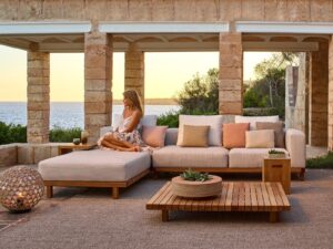 Auch die Textilien sind sorgfältig ausgewählt. Hochwertige Outdoor-Stoffe sorgen für angenehmen Sitzkomfort und bleiben gleichzeitig widerstandsfähig gegenüber Sonne, Regen und Temperaturschwankungen. Sie fühlen sich weich an und erinnern eher an hochwertige Indoor-Textilien als an klassische Gartenpolster.