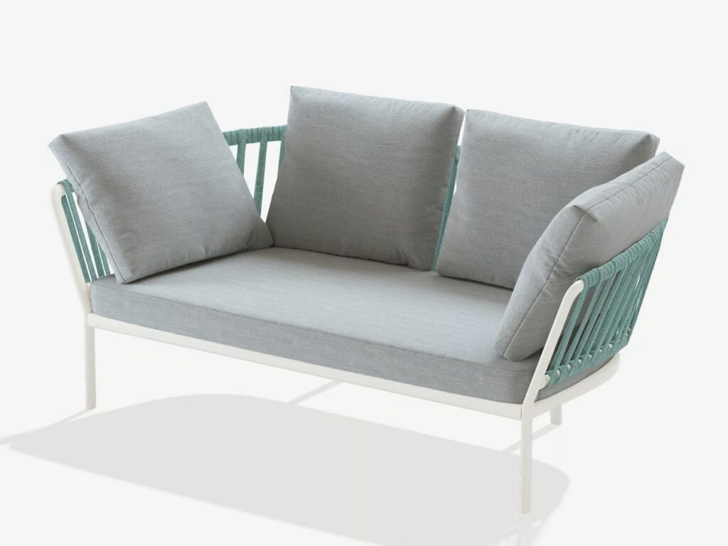 Ria ist ein zweisitziges Gartensofa aus lackiertem Aluminium mit Sitzkissen aus Stoff.