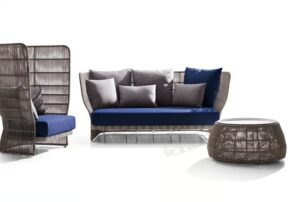 Canasta ’13 von Patricia Urquiola zieht sich in farbe tortora melange an, mit der neuen faser aus polyäthylen, die ein geflecht gebildet hat, das an die kollektion Crinoline der gleichen designerin erinnert. Neue stoffe für sofas, sessel, kleine sessel mit kleinem tischen, in harmonie mit den neuen farbtonen.