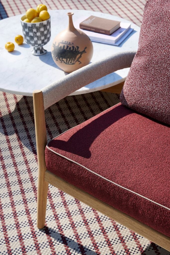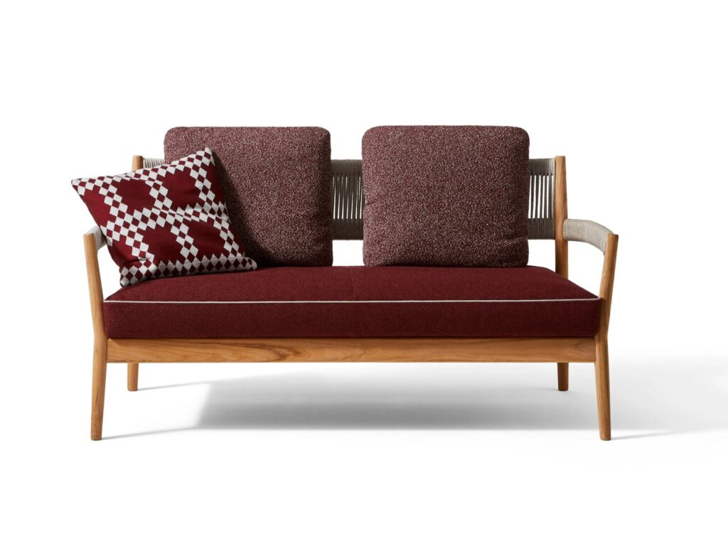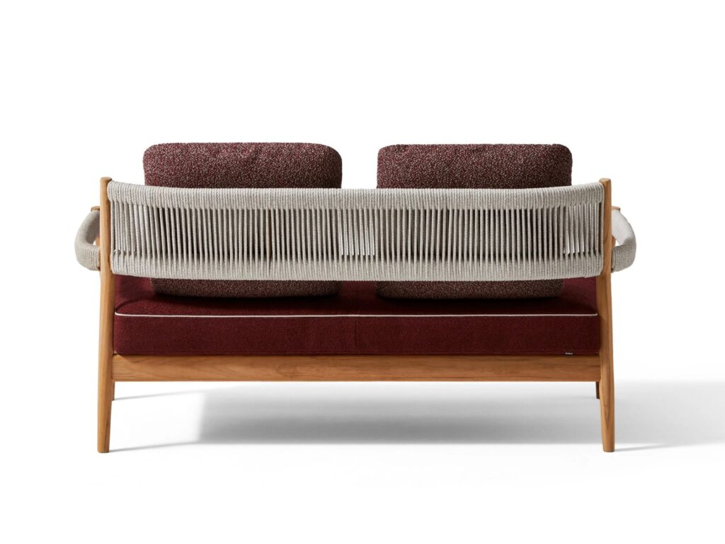 Teakholz, Kordel und Bezüge aus technischem Gewebe: Strapazierfähige Qualitätsmaterialien kennzeichnen dieses Outdoor-Sofa mit seinen klaren und raffinierten Linien.