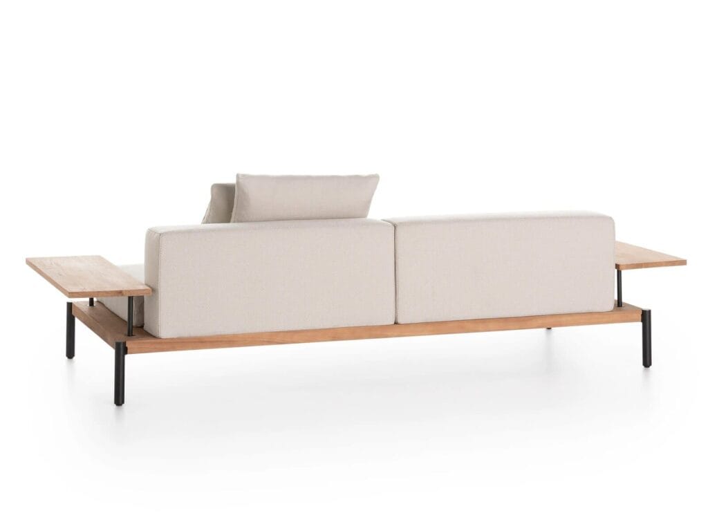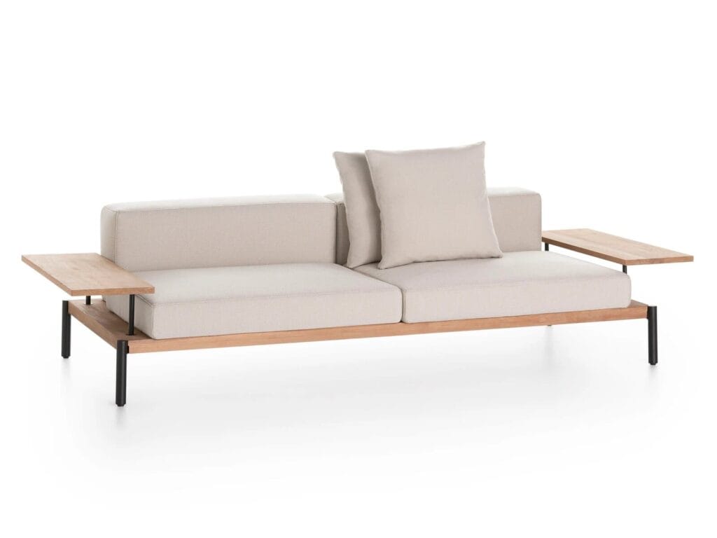 Lademadera ist ein Sofa mit abnehmbarer technischer Polsterung für den Aussenbereich, Teakholz und schwarz pulverbeschichtetem Aluminiumgestell.