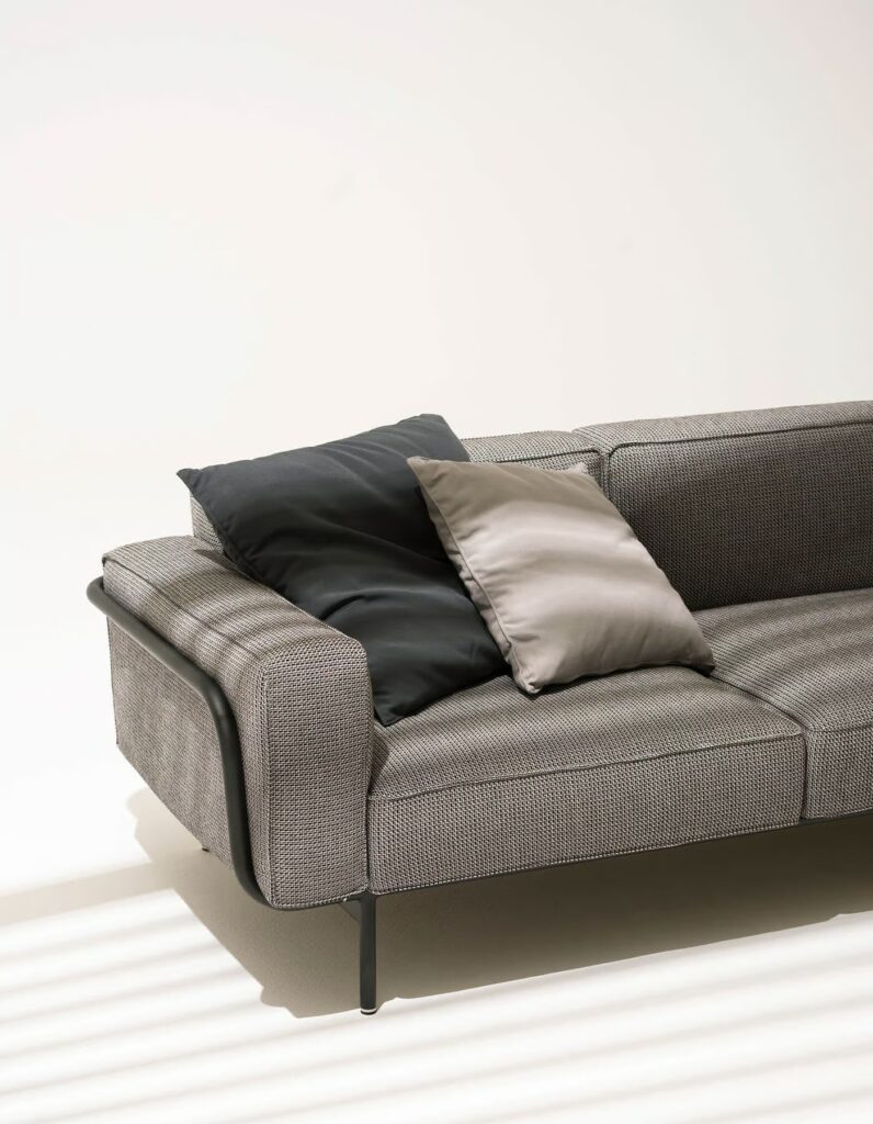 Die beiden Hauptprofile, die sich vorne unter dem Sitz und am Ende der Rückenlehne befinden, ermöglichen die Verbindung zwischen den verschiedenen Elementen und die Verlängerung des Sofas selbst, auch dank der verdeckten Verbindungen aus Aluminiumdruckguss.