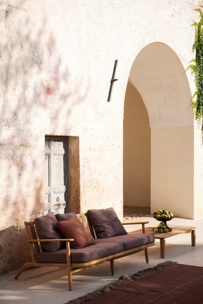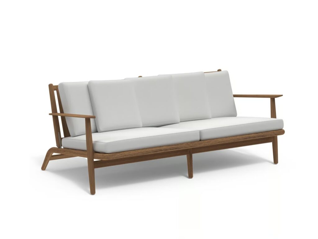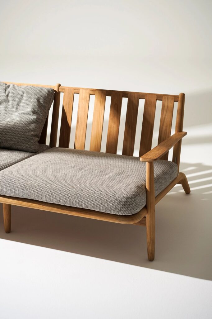 Die Struktur aus Teak-Holz zeichnet sich durch eine raffinierte Keilzinkenverbindung aus. Die Sitzkissen sind weich und von informeller Ästhetik, lassen sich spontan anordnen und genießen, können aufeinander abgestimmt und individualisierbar sein, dank der breiten Stoffauswahl des RODA-Angebots, einschließlich der neuen hochwertigen ökologischen Acrylgarne.