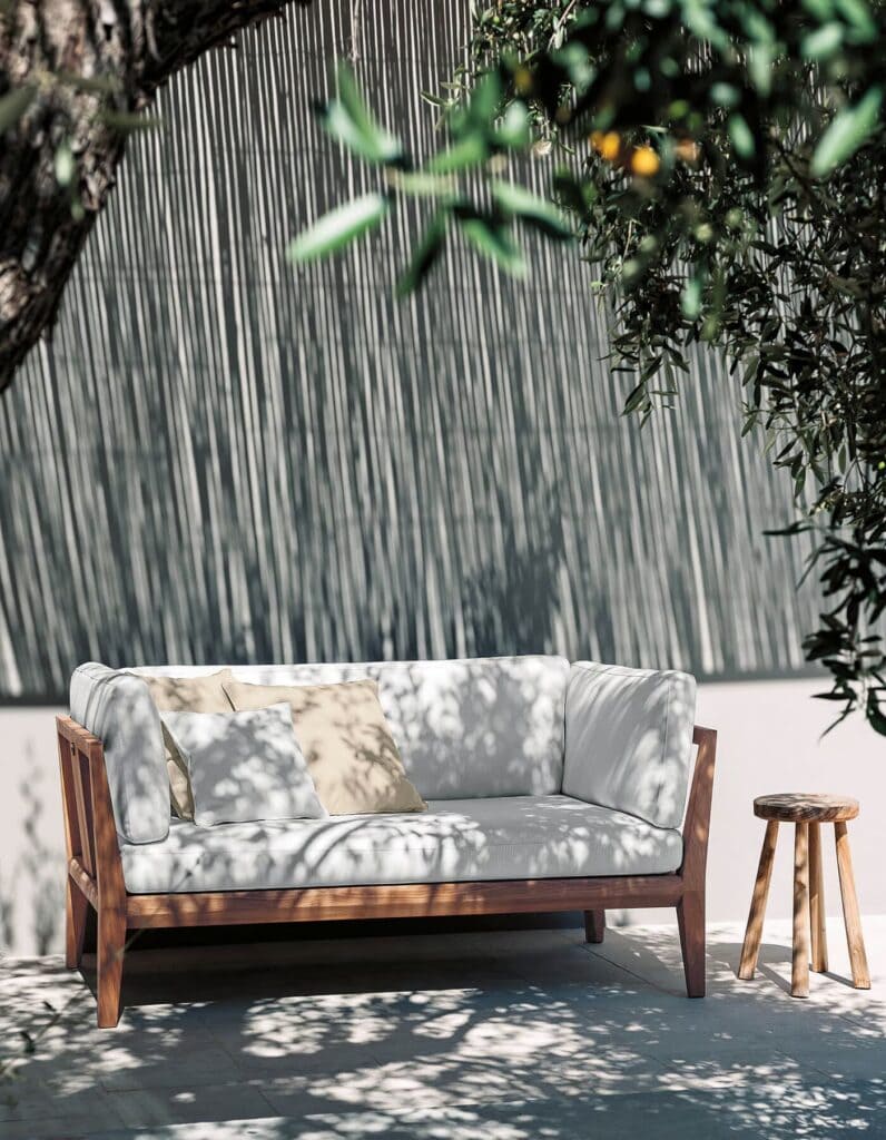 TEKA 001 is a two-seater garden sofa with teak armrests.