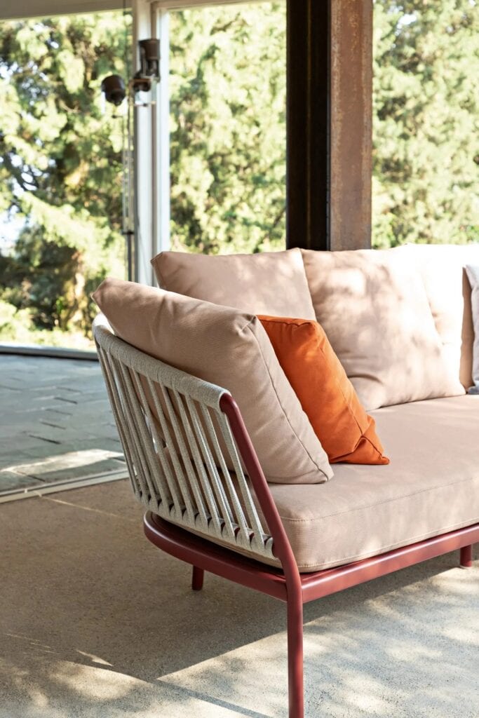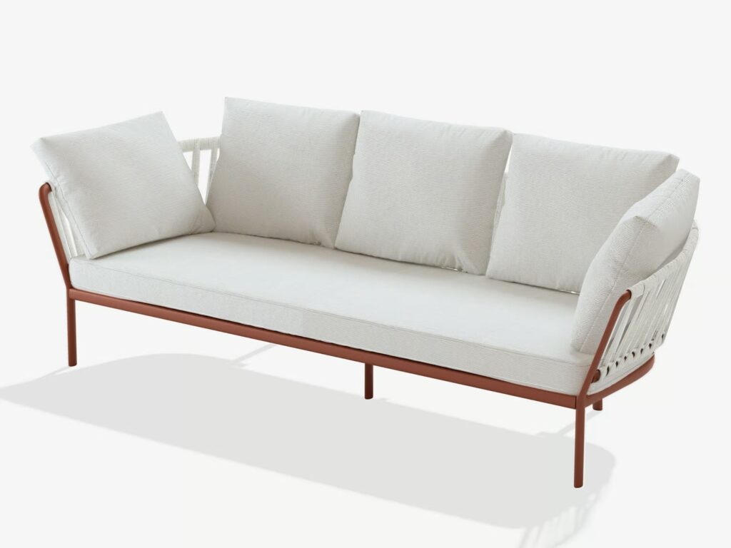 Ria ist ein dreisitziges Gartensofa aus lackiertem Aluminium mit Sitzkissen aus Stoff.