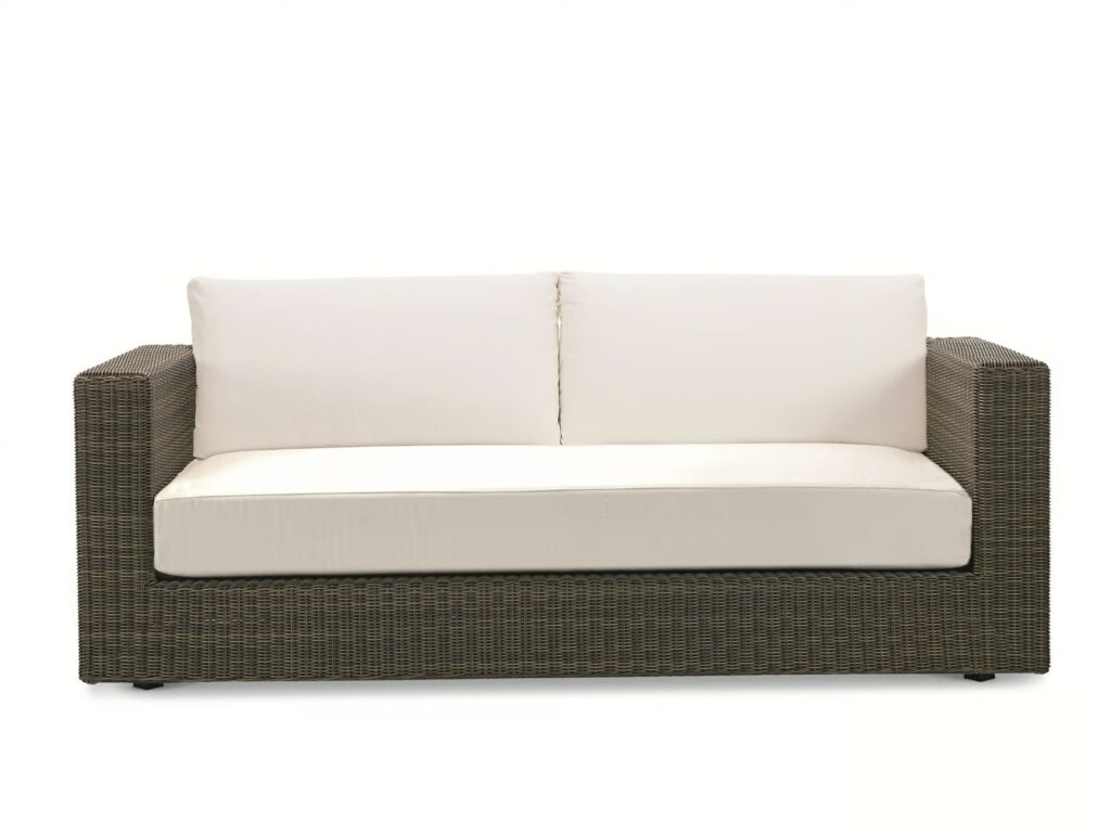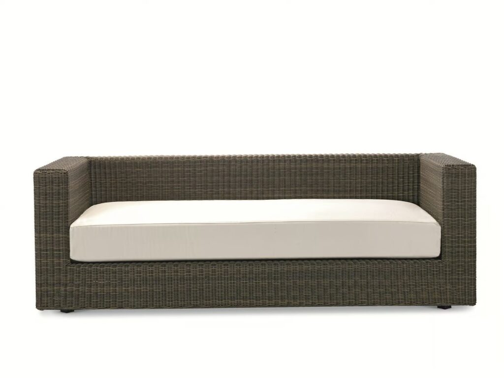 Cube ist ein Dreisitzer-Sofa aus EtWick-Faser mit Sitzkissen (Stofffarbe nach Wahl) und Gestell in Rindenfarbe oder Weiss.