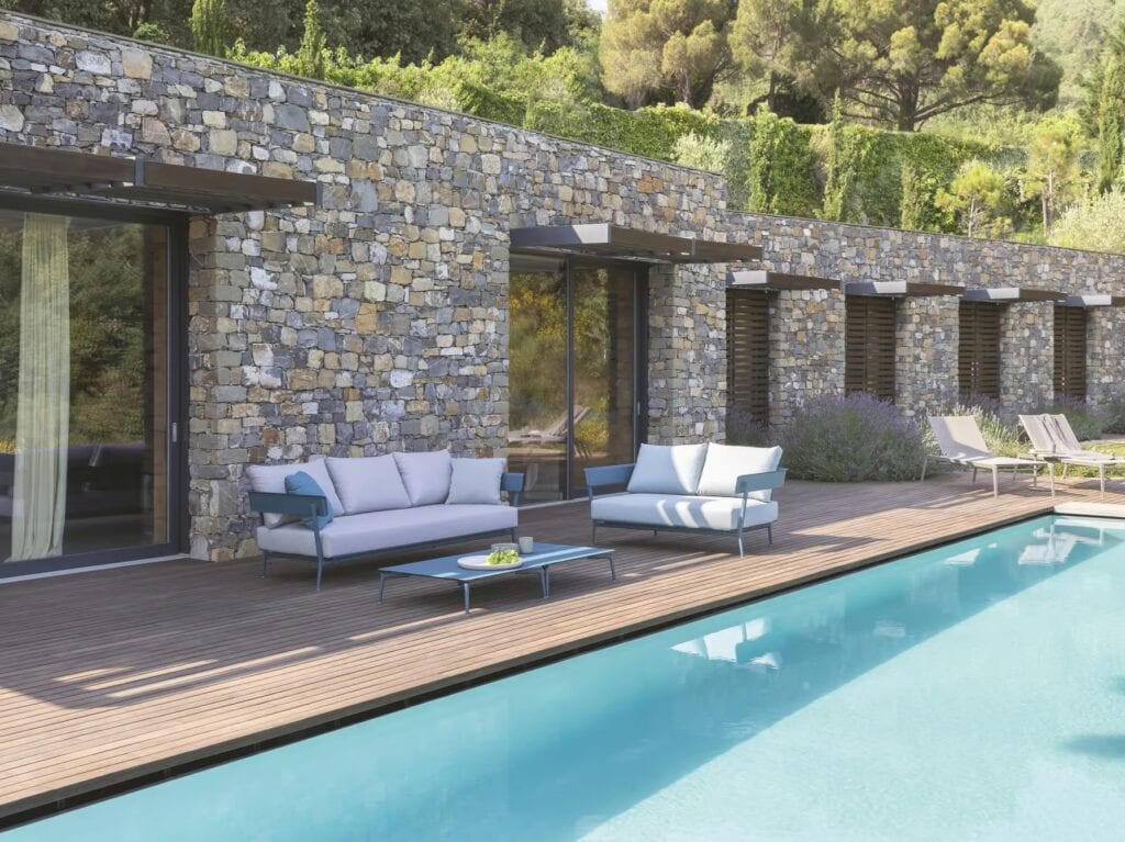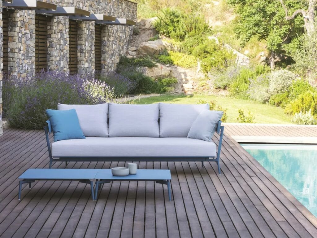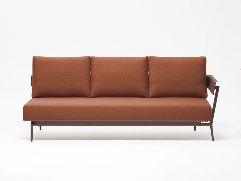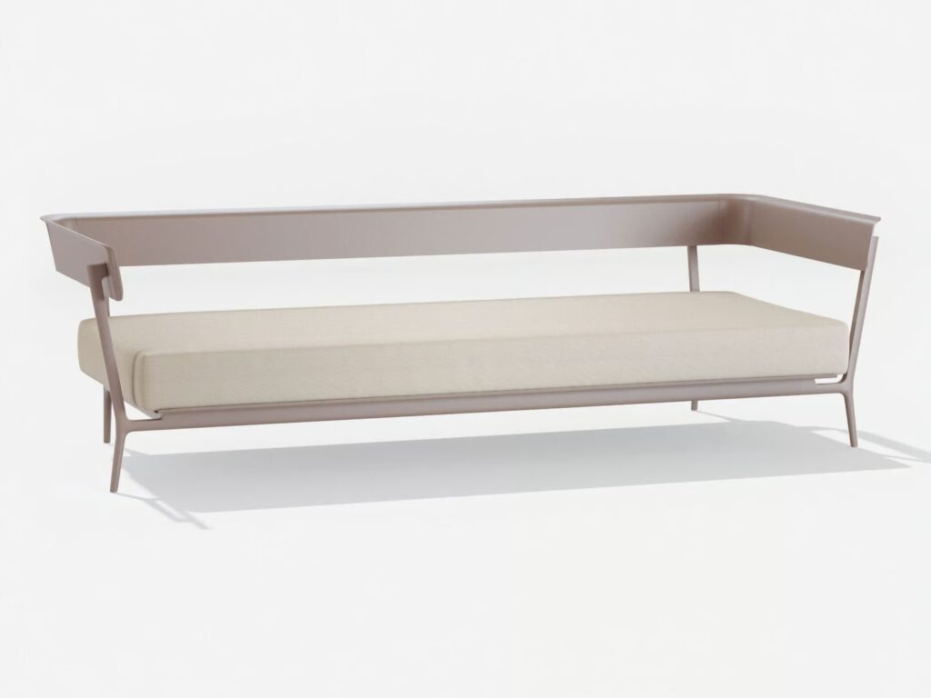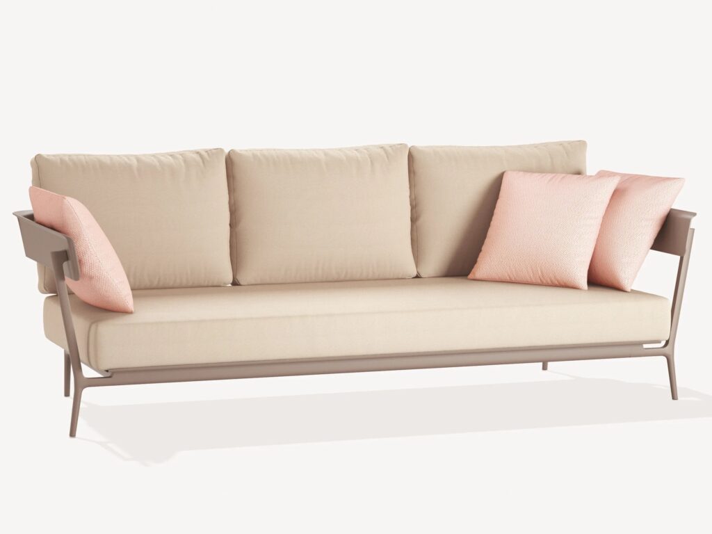 Aikana is a 3 seater garden sofa with painted aluminum armrests and seat cushion. The backrest cushions are optionals.