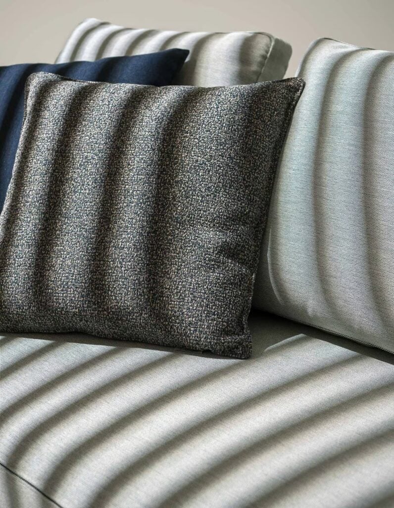 The core of all the elements in the collection consists of an aluminum shell, lightweight yet extremely robust, hidden by a padding with total outdoor technology that is fully draining, breathable, and resistant to weather elements. Dandy is covered with a textile upholstery, available in a wide range of fabrics inspired by natural textures and contemporary color palettes. All the covers are attached to the structure and are easily removable for cleaning or storage during the winter season.