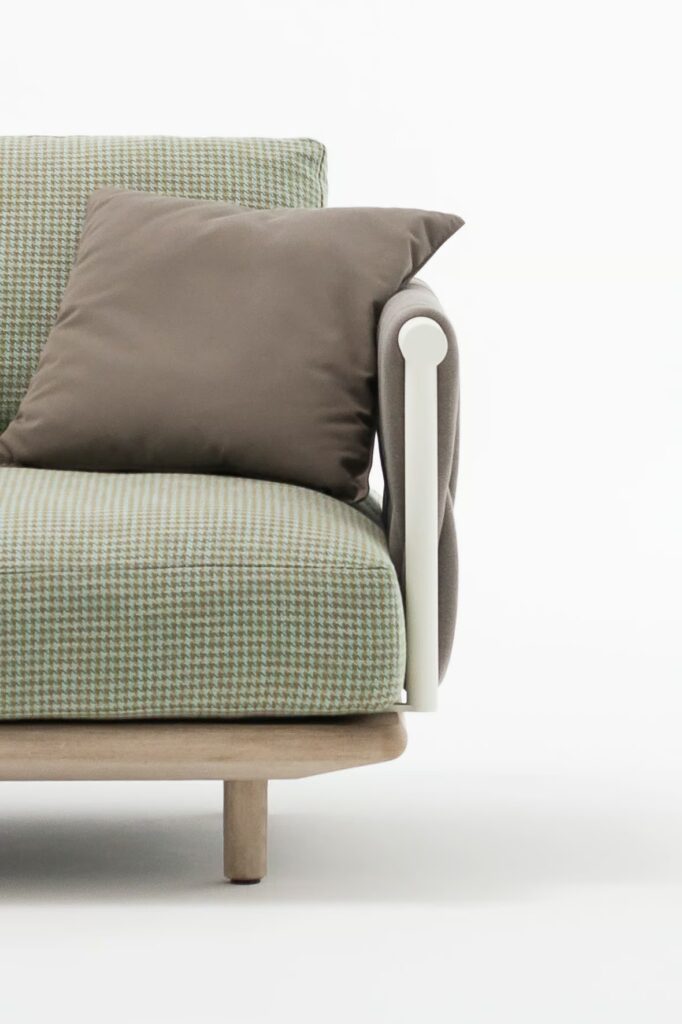Ist dies die erste Sofakollektion mit einer Struktur, die auf so innovative und harmonische Weise zwei charakteristische Materialien vereint: Teakholz und lackierter Edelstahl.