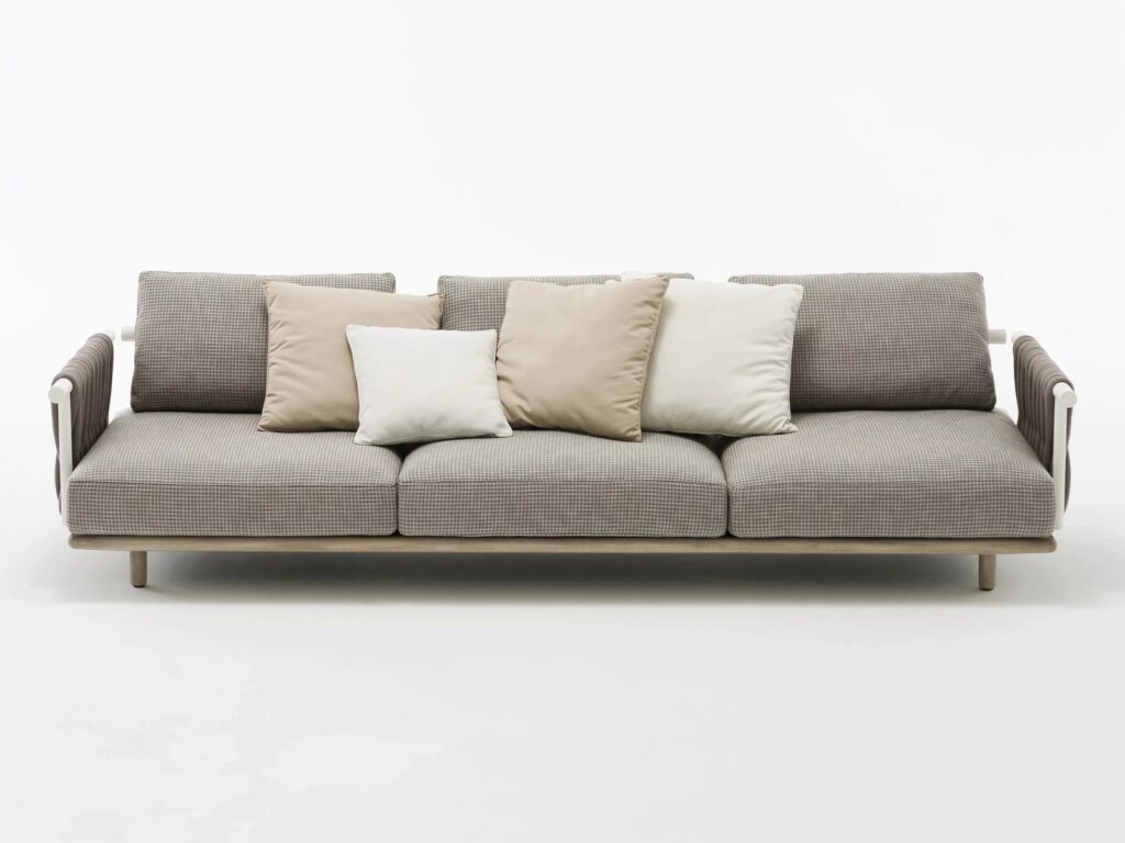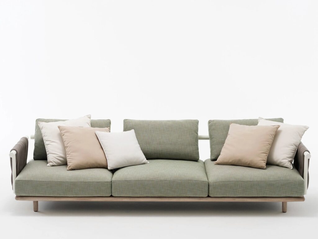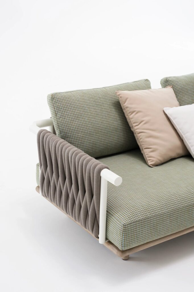 Generous in its shapes, particularly evident in the depth and thickness of the cushions, this collection is characterized by great modularity and an innovative combination of materials.