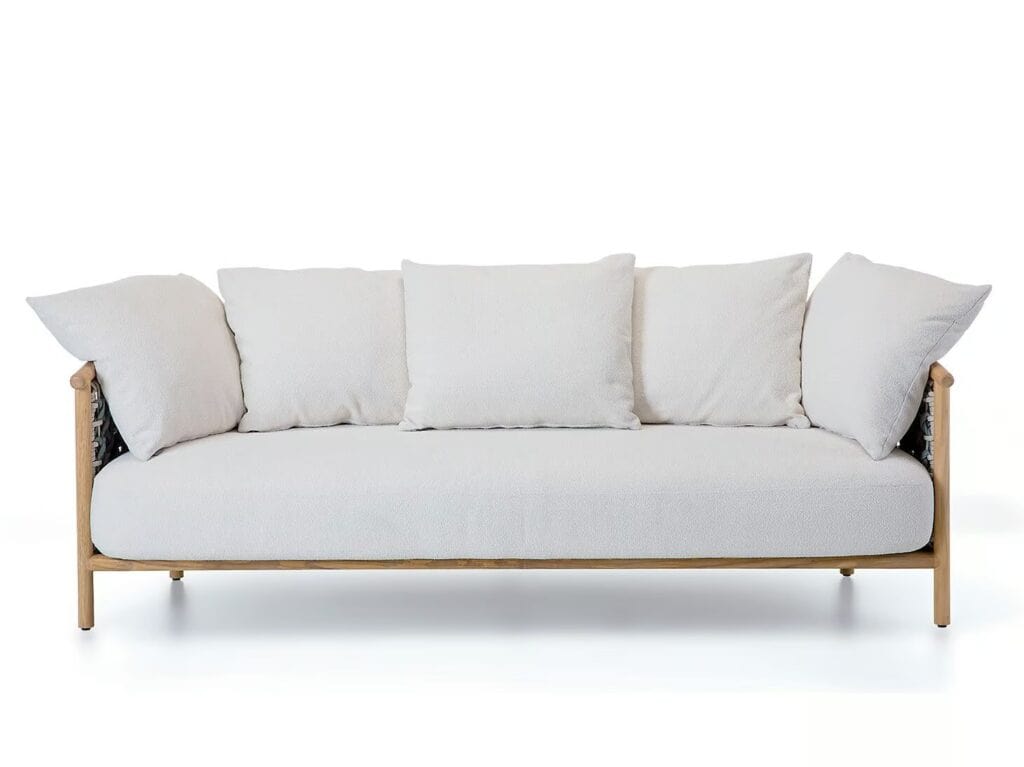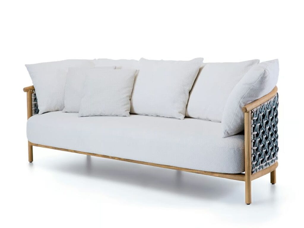 Patio ist ein dreisitziges Gartensofa mit einem Rahmen aus natürlichem Teakholz und einer Rückenlehne aus Laguna und Light Grey Flat Cord. Kissen aus Polypropylen Mother Pearl.
