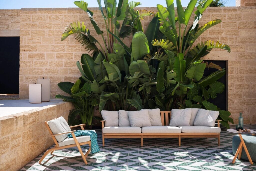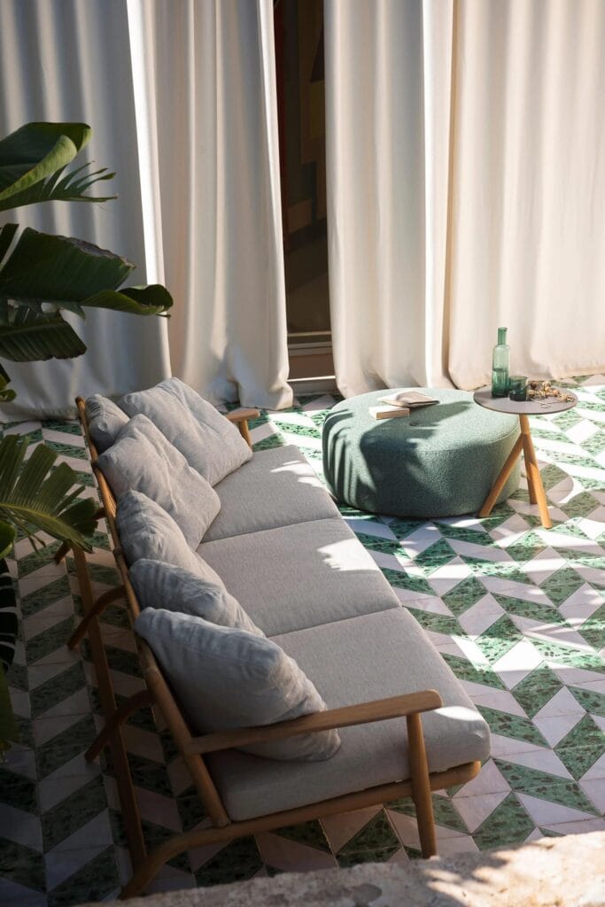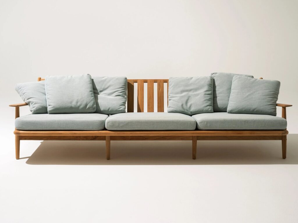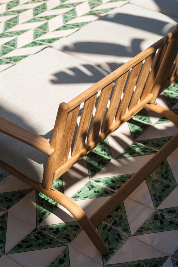 Die Struktur aus Teak-Holz zeichnet sich durch eine raffinierte Keilzinkenverbindung aus. Die Sitzkissen sind weich und von informeller Ästhetik, lassen sich spontan anordnen und genießen, können aufeinander abgestimmt und individualisierbar sein, dank der breiten Stoffauswahl des RODA-Angebots, einschließlich der neuen hochwertigen ökologischen Acrylgarne.