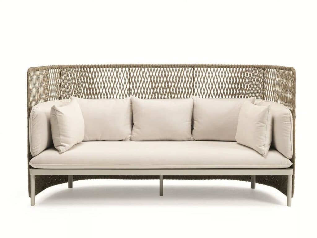 ESEDRA | Sofa - Die Form des Sofas, das in zwei verschiedenen Höhen erhältlich ist, wird durch das Fasergeflecht bestimmt, dessen Flechtung an die typischen Körbe der alten Zeit erinnert. Vervollständigt und bequem wird das Sofa durch eine wasserdichte und UV-beständige Acrylpolsterung, die leicht und langlebig ist.