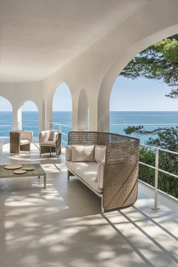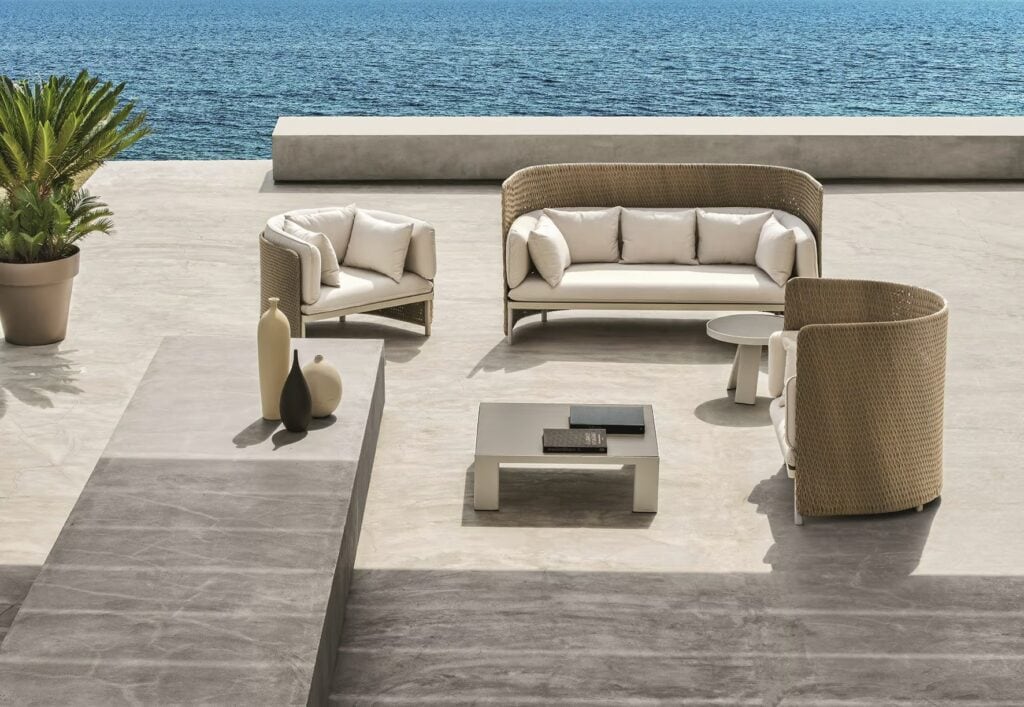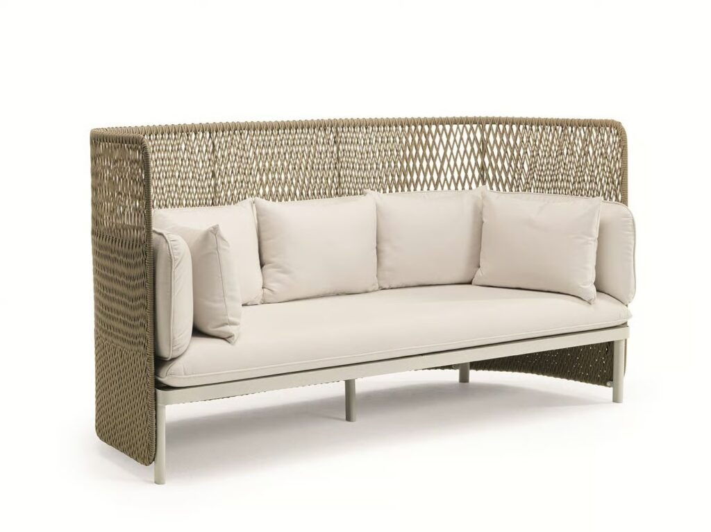 Die von Luca Nichetto entworfene Outdoor-Kollektion Esedra, der Star des neuen Ethimo-Katalogs, besticht durch ihre Ästhetik und ungewöhnliche Texturen. Zur Zeit der alten Römer war die "Exedra" ein halbkreisförmiger Raum, in dem gesellschaftliche Versammlungen und philosophische Debatten stattfanden. Die Kollektion Esedra lehnt sich an dieses Element der klassischen Architektur an, um ein komplettes Sortiment an Möbeln für einen zeitgenössischen Look im Freien zu schaffen. Dabei wird eine Beziehung zwischen den verschiedenen Materialien hergestellt, wie z. B. der Kunstfaser für die Rückenlehnen, die mit einer Technologie behandelt wird, die das Gefühl von gewebten Naturfasern vermittelt, der Stoffbezug der Kissen und die Aluminiumbeine.