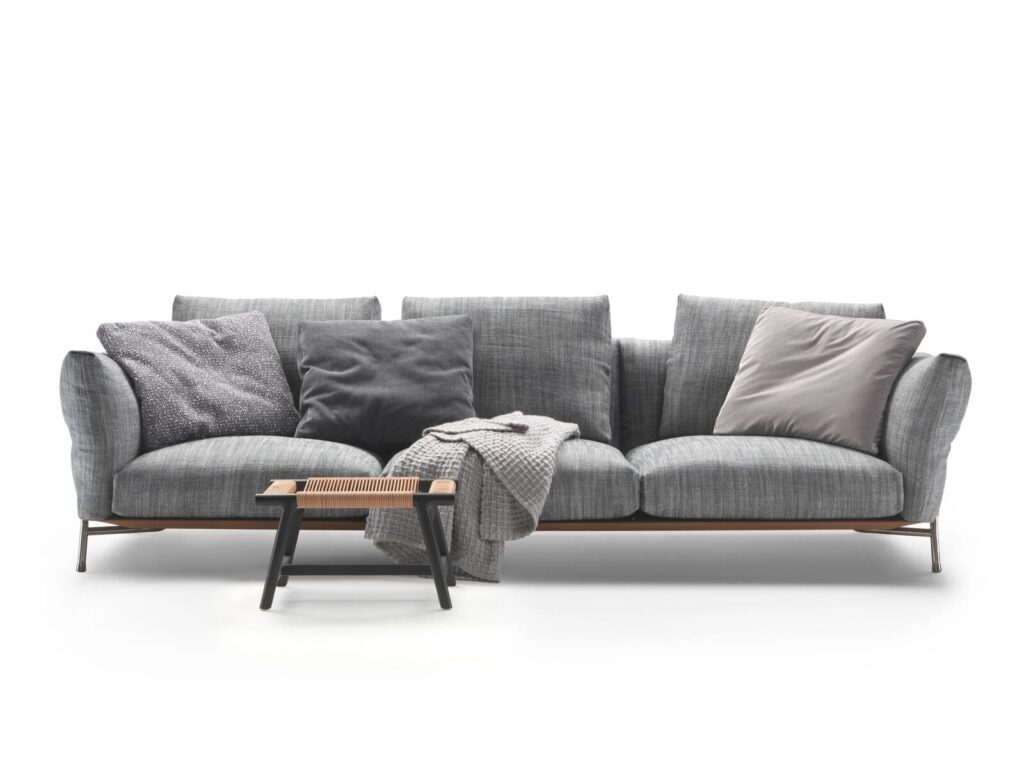 AMBROEUS - Ein Sofa im Stil der Bourgeoisie und die perfekte Verbindung aus Eleganz, Komfort und einem handwerklichen Savoir-faire, das mehr denn je im Trend liegt und das Aushängeschild der Produktion Flexform ist. Mit seinen besonders üppigen und weichen Polsterungen, die komfortabel wie bequeme Kissen sind, vermittelt das Sofa Ambroeus auf den ersten Blick den Eindruck von unvergleichlicher Behaglichkeit. Die Leichtigkeit des Metallgestells, das in verschiedenen Oberflächen erhältlich ist, stellt einen ansprechenden Kontrast zu den großzügigen Sitzkissen und Rückenkissen mit weicher Polsterung aus Gänsedaunen dar, die auf dem mit Kernleder bezogenen Untergestell aufliegen. Charakteristisches Element des Projekts ist die elegante Armlehne aus Metall mit Lederbezug, die in die beiden schlanken Füße übergeht. Die Kissenbezüge sind mit einer eleganten Falte konfektioniert, die das Ergebnis einer komplexen Verarbeitung und Ausdruck der Handwerkskunst und des Könnens von Flexform ist. Das Sofa Ambroeus ist als gerades Zweisitzer- oder Dreisitzersofa und als Ecksofa in verschiedenen Konfigurierungen erhältlich.