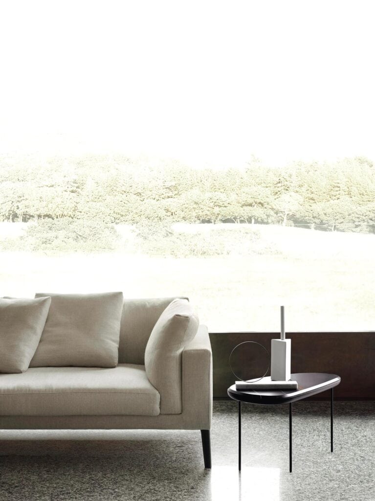 FLOYD-HI 2 ist ein geradliniges Sofa und Sessel mit einer Rücken- und Armlehnenstruktur aus mehrschichtigem Pappelholz und doppelt getäfeltem Tannenholz, gepolstert mit Polyurethanschaum unterschiedlicher Dichte und einer Bespannung aus vernadeltem, geharztem Polyestervlies, das auf einen Polyamid-Velvetenträger geklebt ist. Sitzgestell aus Stahl mit Epoxy-Pulverbeschichtung, gefedert mit beschichteten Gummibändern, gepolstert mit Polyurethanschaum, bezogen mit 100% Polyäther, thermisch gebunden auf einem Polyamidsamt-Träger. Rückenlehnen- und Armlehnenpolster aus vorgewaschenen und sterilisierten Gänsedaunen, in getrennten Fächern abgesteppt, mit Polyurethanschaumeinlage.