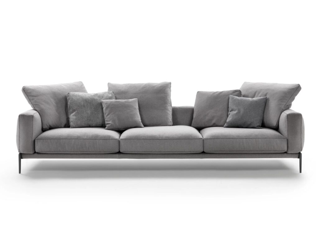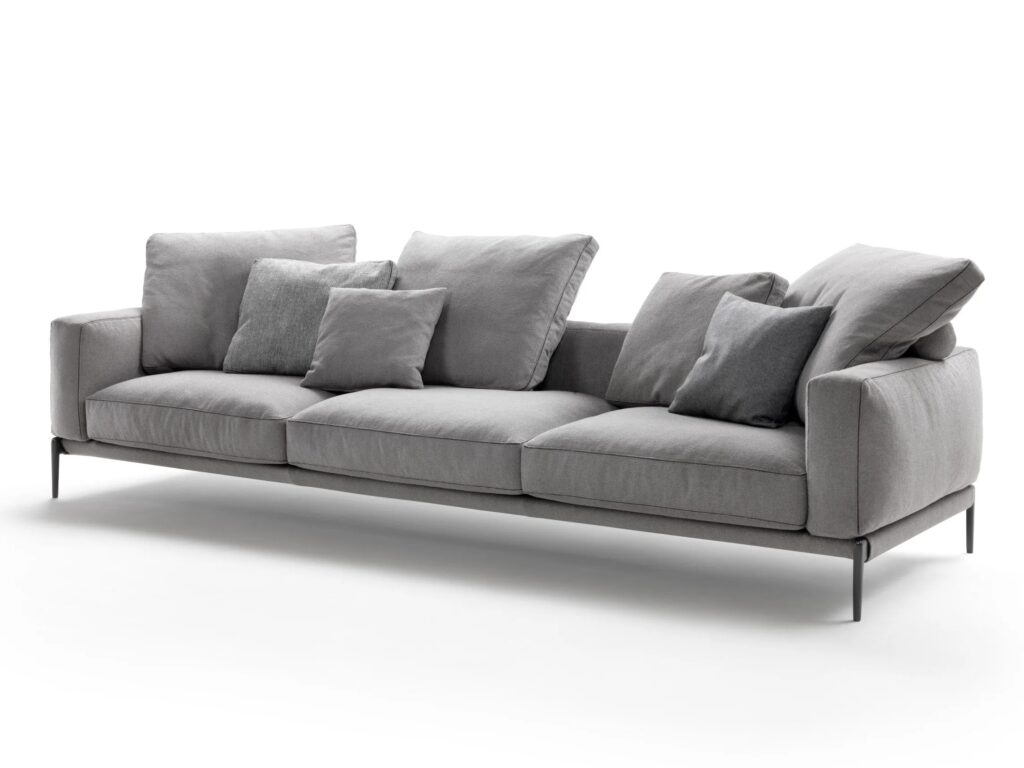 Das Sofa Romeo hebt sich mit schlanken Füßen aus Aluminiumdruckguss von Boden ab und zeichnet sich durch seine ästhetisch leichte Linienführung aus, mit Proportionen und Details, die vom schneiderischen Können der Firma zeugen, wie das feine Gros Grain Umrandungsprofil, das alle Nähte nachzeichnet und die Harmonie der Formen unterstreicht. Dank der perfekten Neigung des Sitzes und der großzügigen Daunenpolsterung der Kissen, zeigt das Sofa Romeo erneut das Engagement der Firma, schlichte Eleganz mit hohem Niveau an Komfort zu verbinden. Romeo ist ein Sitzprogramm, das sich durch seine enorme Vielseitigkeit auszeichnet, die es ihm erlaubt, mit gleicher Nonchalance alle Stoffe und Lederarten der Kollektion Flexform zu tragen und jedes Mal eine andere Persönlichkeit anzunehmen. Das Sofa Romeo eignet sich also zur Einrichtung aller Räumlichkeiten, von minimalistisch geprägten Kontexten bis zu mehr klassisch gestalteten.