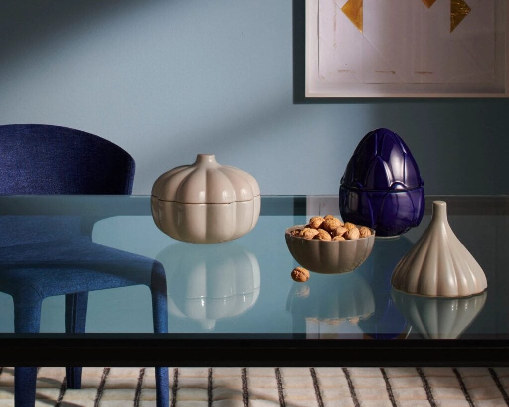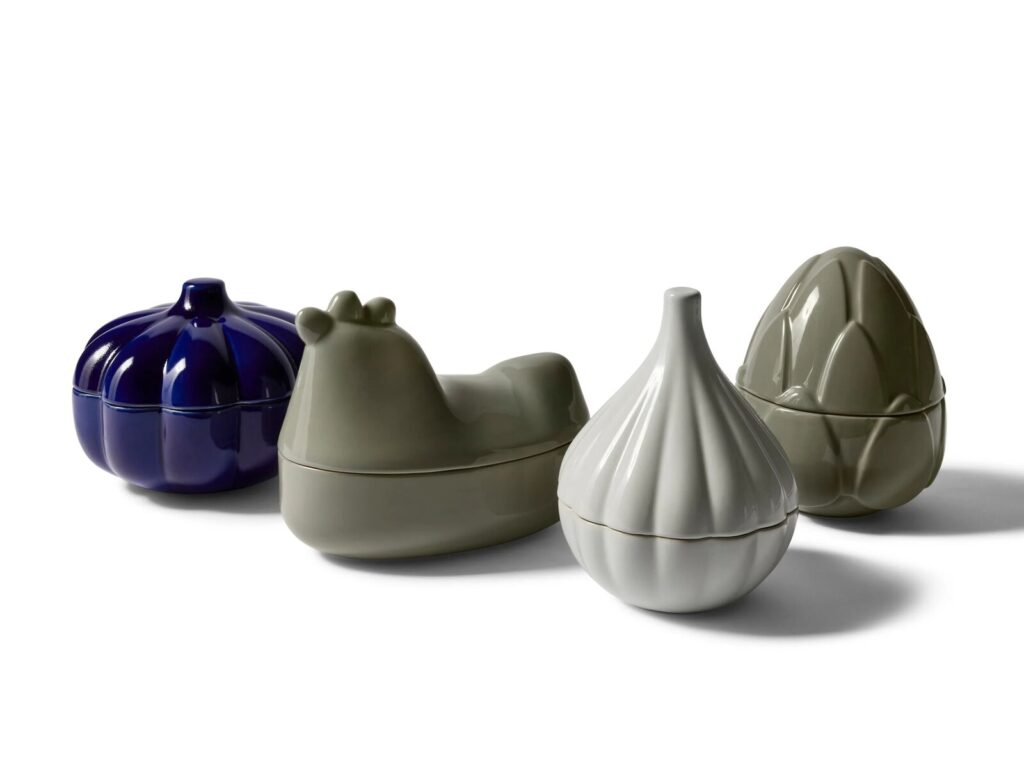 Taac ist eine metaphorische Interpretation des Begriffs "saisonal", wenn es um Lebensmittel geht, die sich in Objekten ausdrückt, die von der Natur und den Aromen inspiriert sind, die unser tägliches Leben beleben. Die Kollektion besteht aus vier emaillierten Keramikbehältern in Form eines Kürbisses, einer Zwiebel, eines Spargels und eines Huhns, die in drei Farben erhältlich sind: Gesso (Kreide), Grigio (grau) und Cobalto (kobalt). Durch ihre Wirkung auf die Sinne verstärken diese Elemente die Bedeutung der Zutat selbst: Das Gemüse zum Beispiel erinnert an die Kindheit des Chefkochs Davide Oldani und an die Region Lombardei, in der er aufgewachsen ist. Jedes Stück der Taac-Kollektion besteht aus einem Behälter, dessen Deckel, eine Cloche, das Rezept der auf dem Tisch stehenden Aromen verrät, ein Symbol der Saison ist und die Verwendung vorschlägt. Die Objekte sind funktional, aber auch dekorativ und können in der Küche, aber auch auf dem Tisch oder im Wohnzimmer verwendet werden. Auf dem Boden jedes Behälters befindet sich ein Abziehbild mit dem Namen des Produkts und des Autors sowie dem Cassina-Logo.