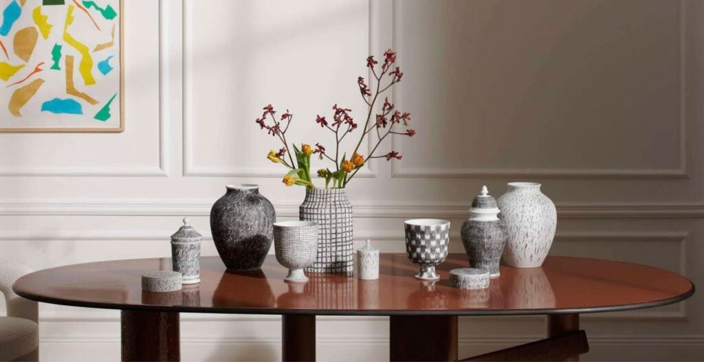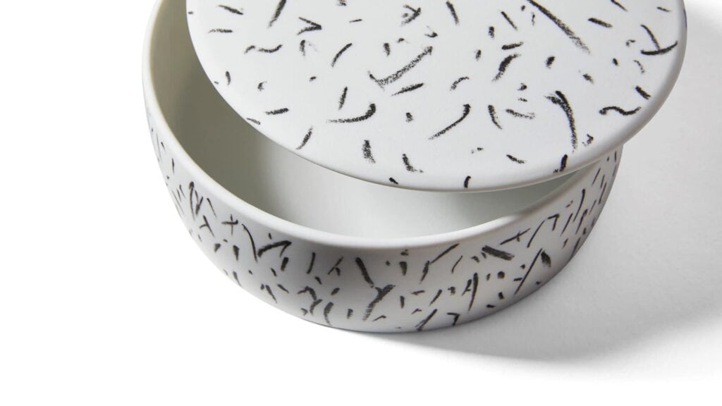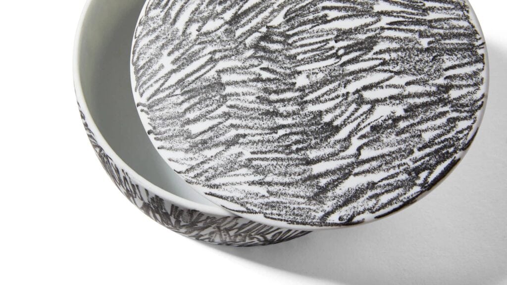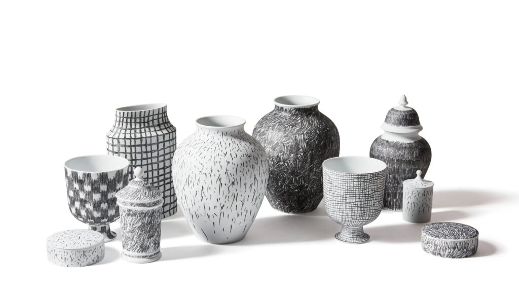 Die Entwürfe von Formafantasma werden dank des Know-hows, des Könnens und der Erfahrung der Malermeister von Ginori 1735 zu Dekorationen auf Porzellan. Sie arbeiten auf natürliche Weise und hinterlassen ihre Spuren durch instinktive Bewegungen, abstrakte Zeichen, die das Konzept der Dekoration aktualisieren. Die Kollektion besteht aus einer Reihe von Vasen mit unterschiedlichen Formen, zeitgenössischen Objekten, die allein stehen oder zu grafischen Kompositionen zusammengefügt werden können. La particolarità della lavorazione consiste nella decorazione “a graffito” sulla porcellana bisquit ottenuta con una cottura diretta: il graffito viene disegnato sulla superficie con un pigmento nero e successivamente fissato.