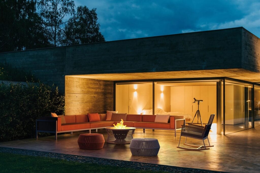 Eine Textilhülle, die fest auf eine unauffällige Metallstruktur aufgeschoben ist - Fila mag wie eine einfache Drahtskulptur aussehen, aber bei Sonnenuntergang ändert sich alles. Dann leuchtet der textile Lampenschirm auf und offenbart ein buntes Schattenspiel in der Nacht. In der eigenen Stoffkollektion von Kettal sehen die Fila-Lampen definitiv am besten aus.