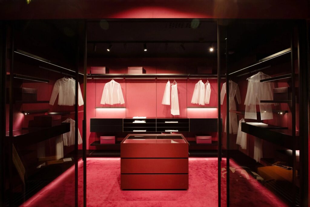 The minimalist geometries and the thin thickness of the panels remain the distinctive features of Ghost Wall – WW. Thanks to Cassina’s in-depth research, Mikal Harrsen’s proposal is transformed into a sophisticated walk-in closet.