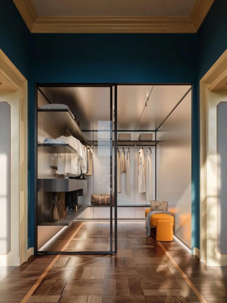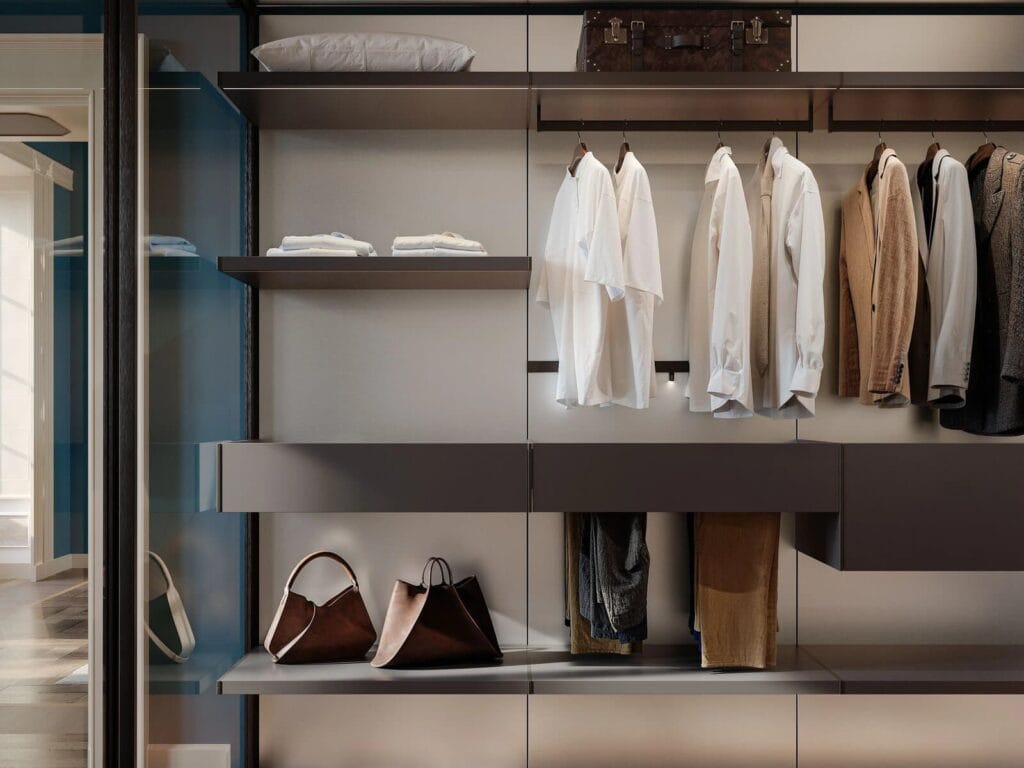 This system, with its elegant and functional design, offers a perfect solution for those looking to create a sophisticated and customized dressing room, blending style, functionality, and innovation.