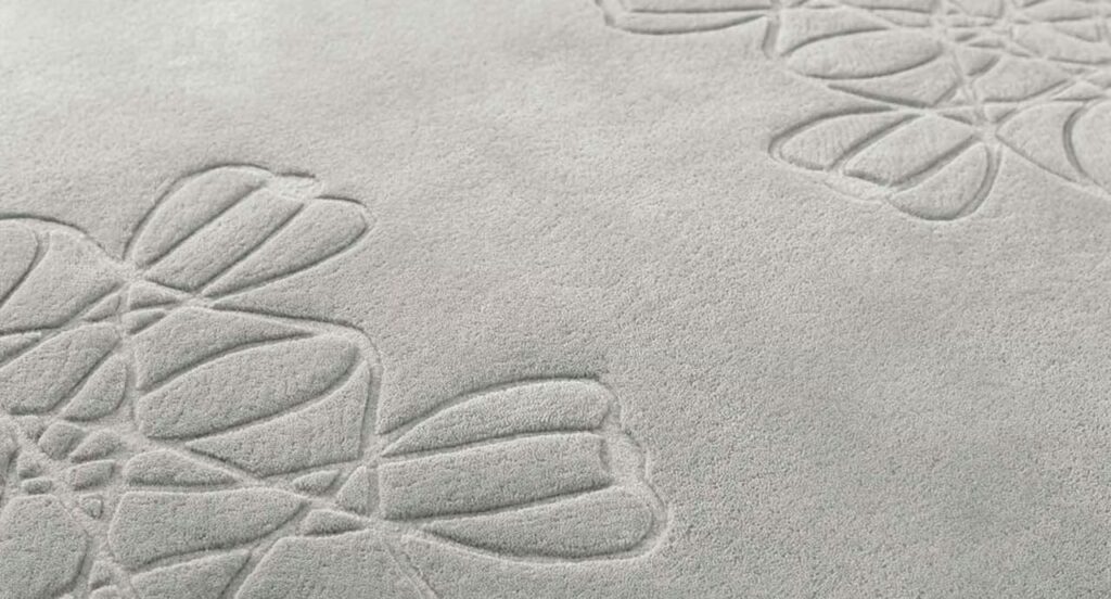 Arabesque ist ein handgetufteter Teppich. Die floralen Muster, die den Teppich in orthogonaler Anordnung schmücken, sind von Hand in die Wolloberfläche geschnitzt. Die Umrisse des Musters sind Ton-in-Ton hergestellt und sind heller und tiefer als die Teppichfläche. Es kann nur eine Farbe gewählt werden.