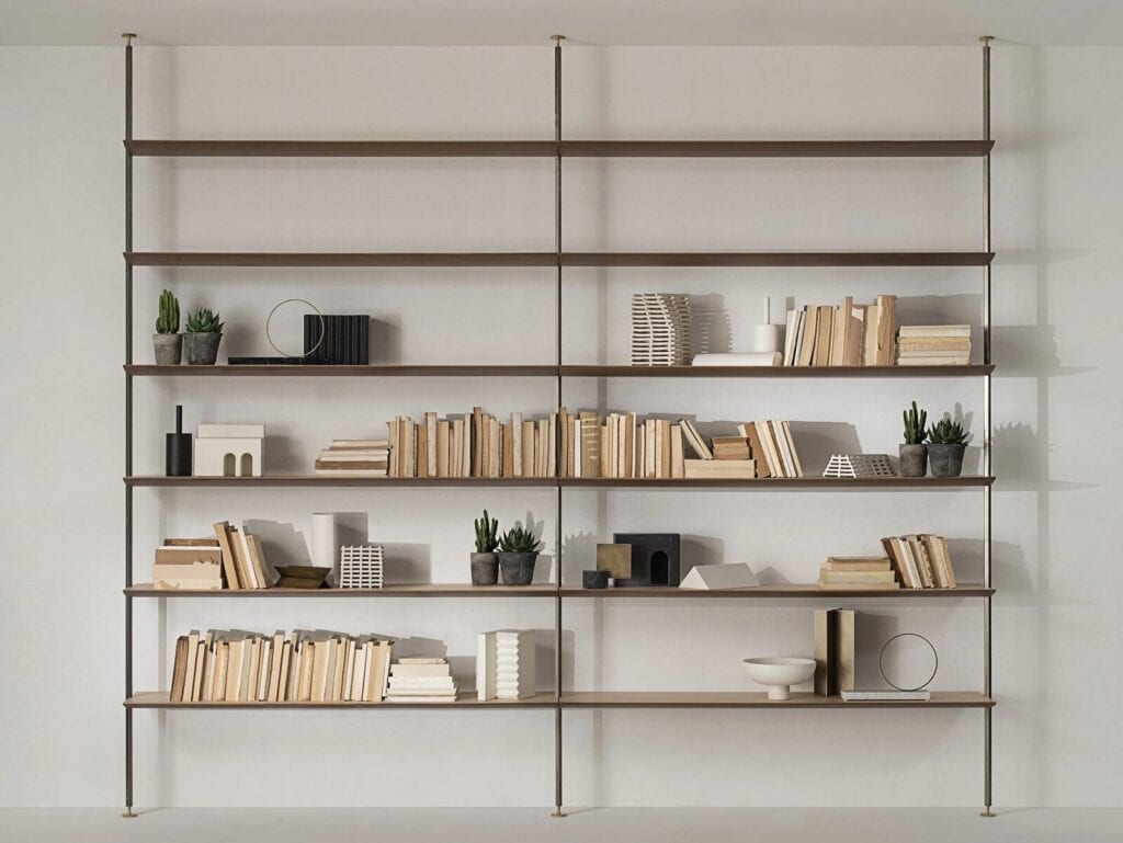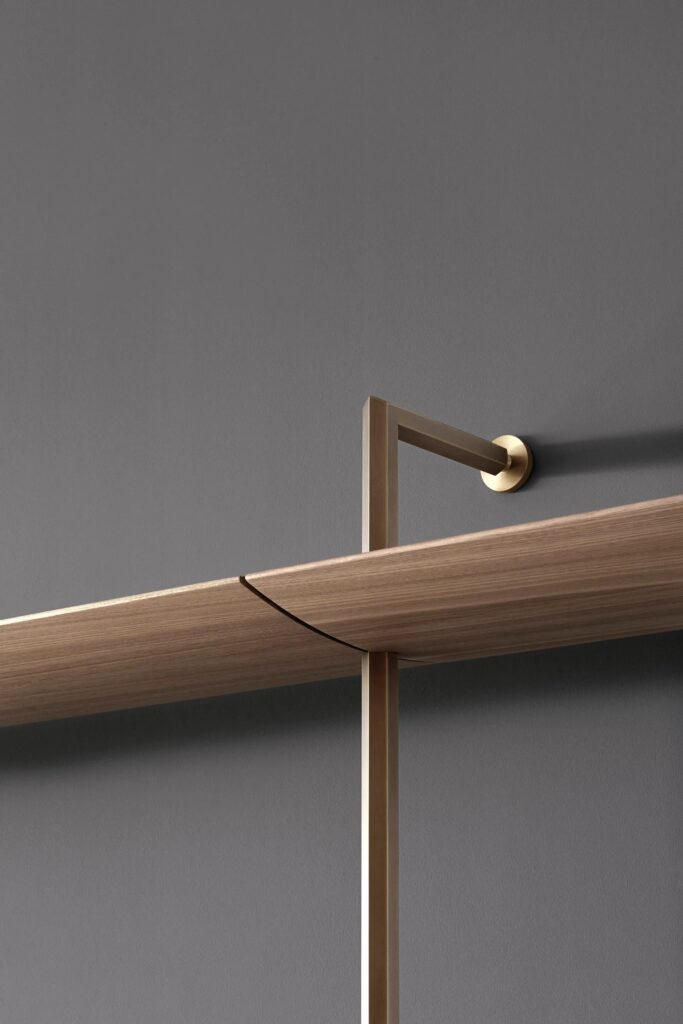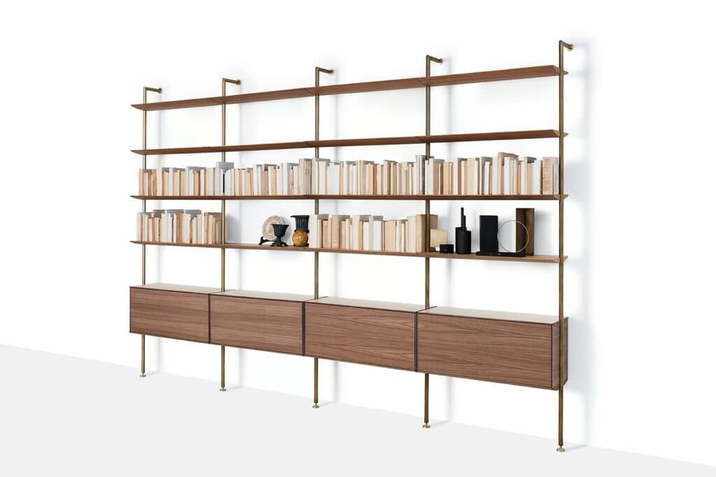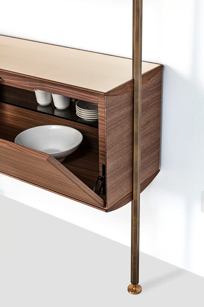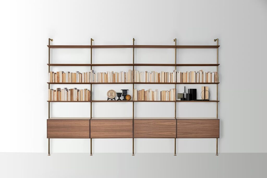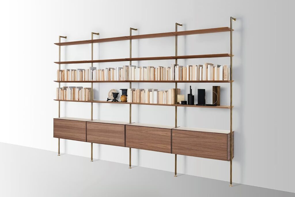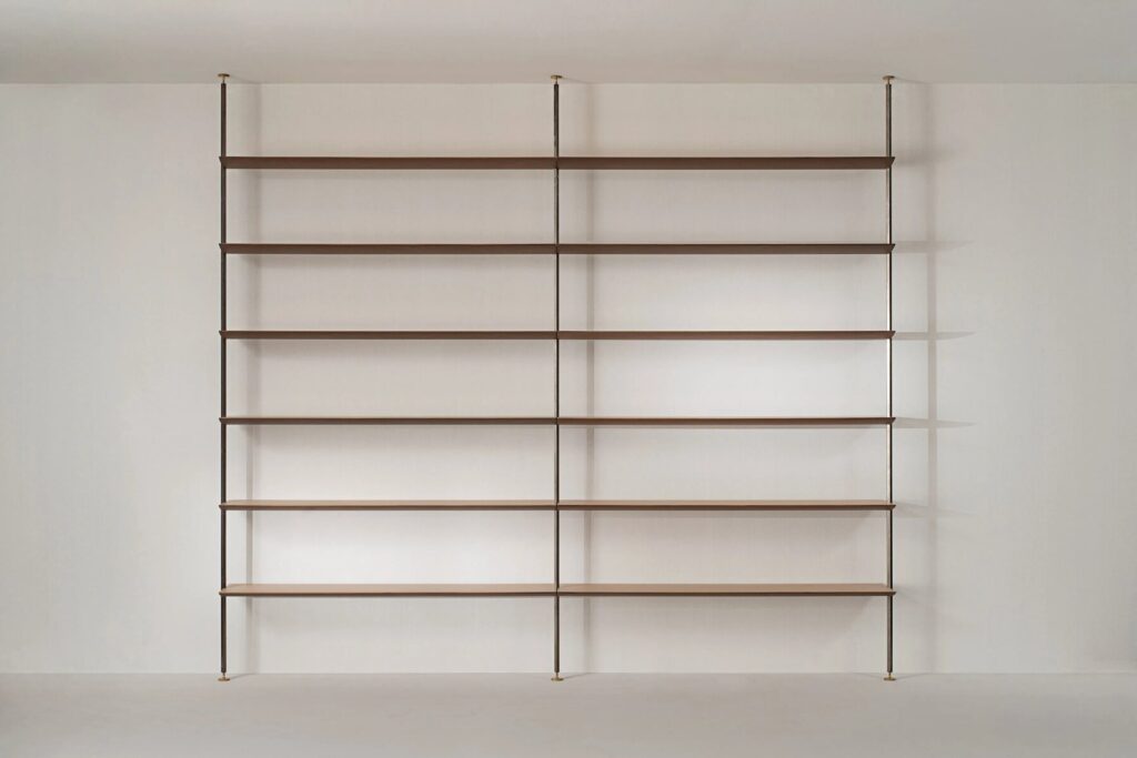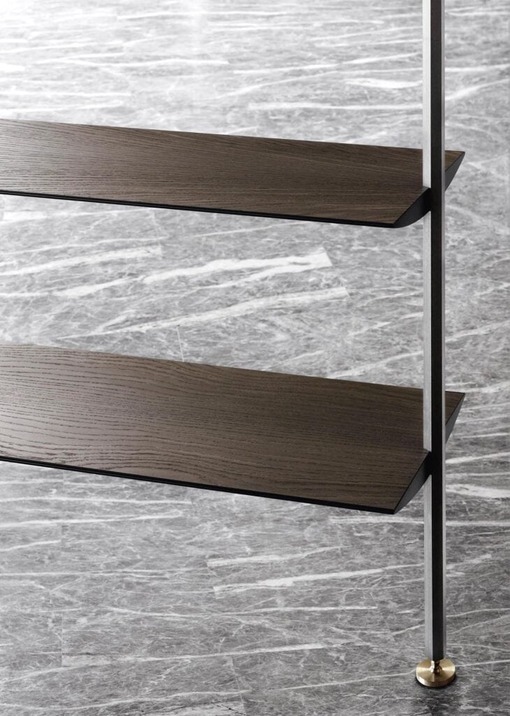 Boden-Decken-Trägerplatten mit Gelenk, Ø50 mm aus satiniertem Messing mit transparentem Mattlack, an den Stützen verschraubt. Boden-, Decken- und Wandhalterung durch schwarze PVC-Elemente gesichert. Maximale Höhe der Stützen: Boden-Decken-Version 305 cm; Wandversion 250 cm mit Platte für die Wandmontage (mit Fischer) und Wandhalterung durch schwarze PVC-Rundstäbe gesichert. Regale in "Kielform" (Länge 75/90/120/150 cm, Tiefe 33 cm) aus stranggepresstem Aluminium, mit einer oberen Platte, die in der Ausführung der Kollektion furniert ist, und mit Endstücken aus Massivholz, immer in der gleichen Ausführung wie der "Kiel", mit Gelenken, die die Befestigung an den Stützen ermöglichen.