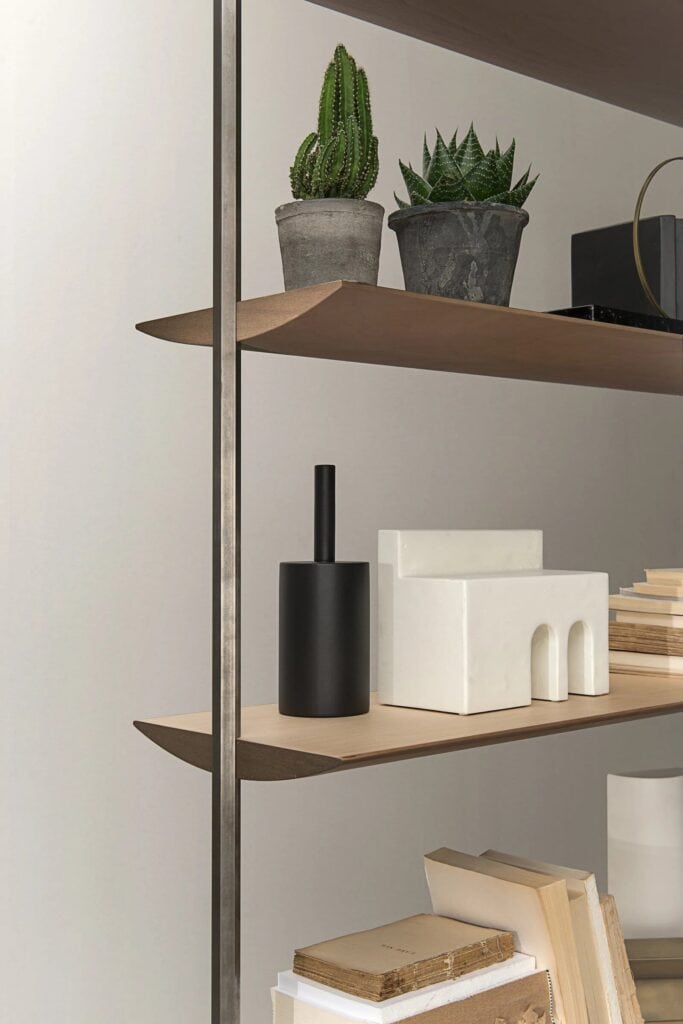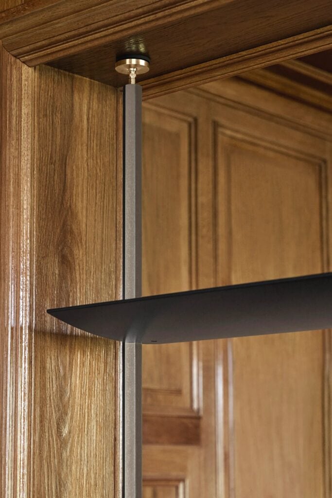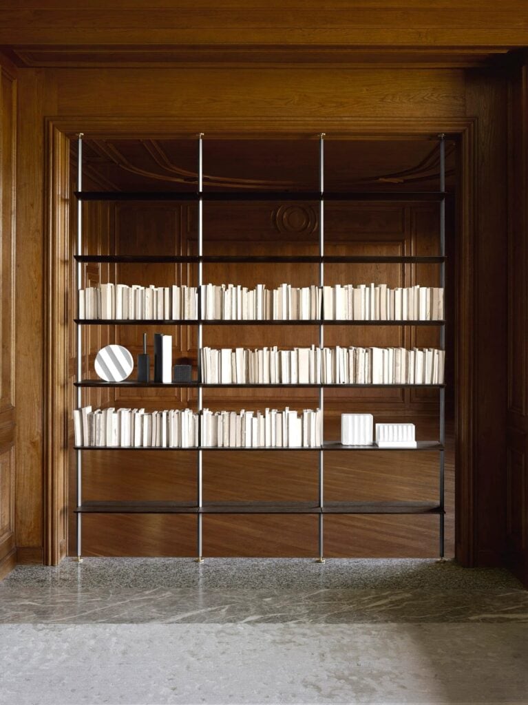 SAILOR ist ein Bücherregal, das von der Welt der Schifffahrt inspiriert ist und maximale Freiheit bei der Aufstellung vom Boden bis zur Decke oder an der Wand bietet. Stahlstützen mit Sechskantprofil 25 mm, mit Bohrungen mit einem Mittenabstand von 38,5 cm (35 cm Nutzraum) für die Montage der Regalböden und einem zusätzlichen Abstandhalter für die Wandbefestigung für eine grössere strukturelle Festigkeit (für beide Versionen). Ausführungen der Stützen: matt transparent flüssiglackierter Stahl oder messingfarbener Stahl mit matt transparenter Oberfläche.