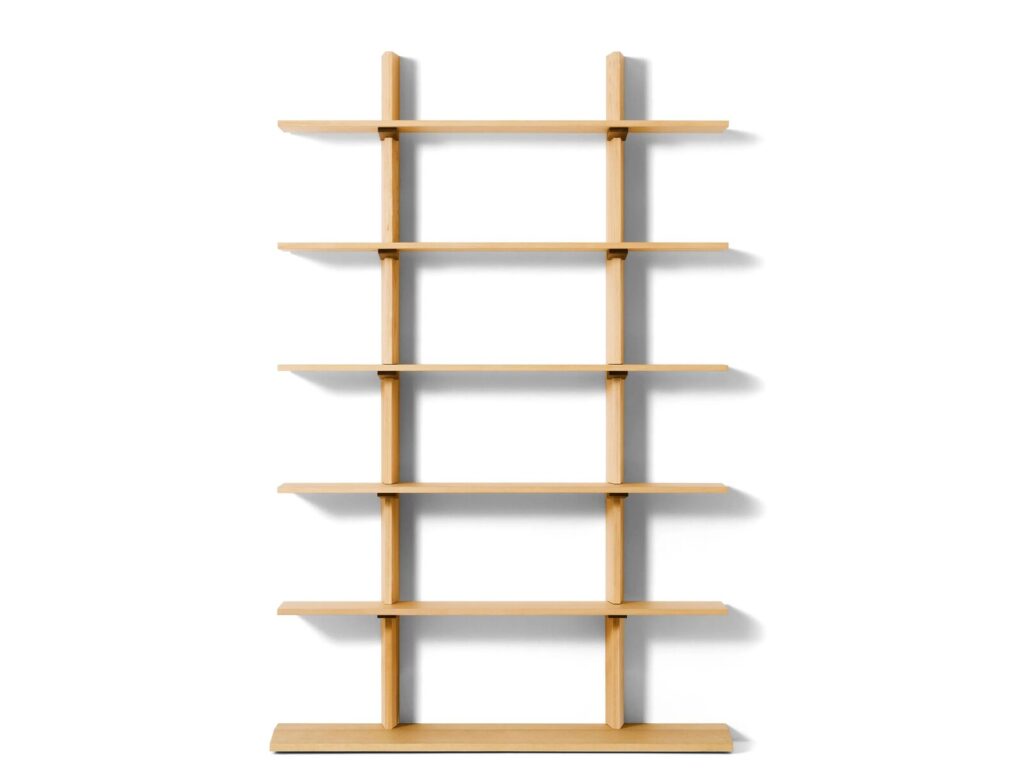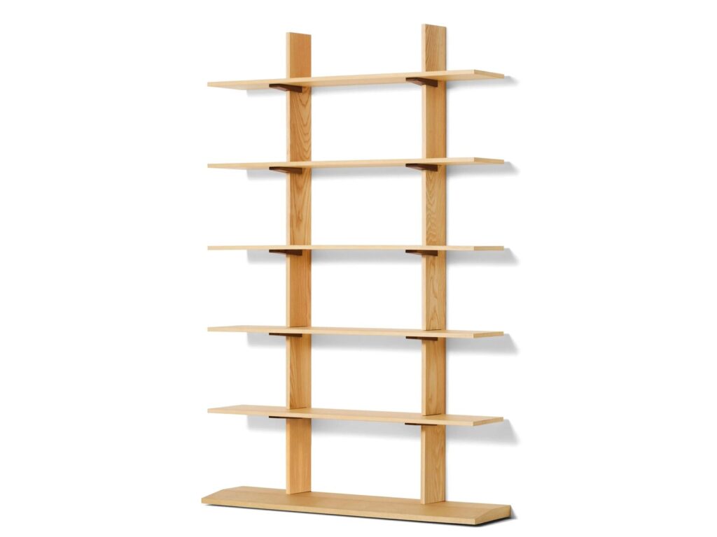 FF. Spine by Formafantasma is a freestanding bookcase that highlights the beauty of solid wood. It is composed of an internal upright structure in epoxy powder-coated steel tubing; solid wood support bracket and upright; and MDF shelves in a sandwich construction with aluminum and wood veneer.