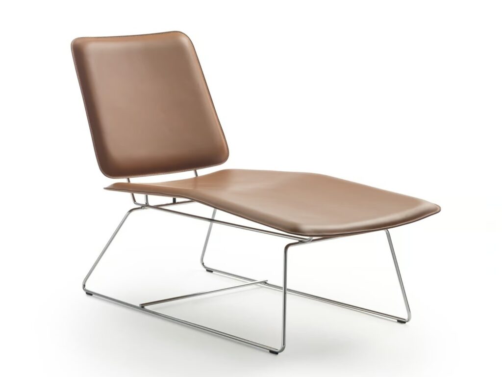 Eine andere stilistische Interpretation zeigt der Dormeuse Echoes S.H., bei dem das Metallgestell mit Leder kombiniert wird: Eine einfache, aber effektvolle Kombination, die dank der ergonomischen Form von Sitz und Rückenlehne hohen Komfort garantiert.
