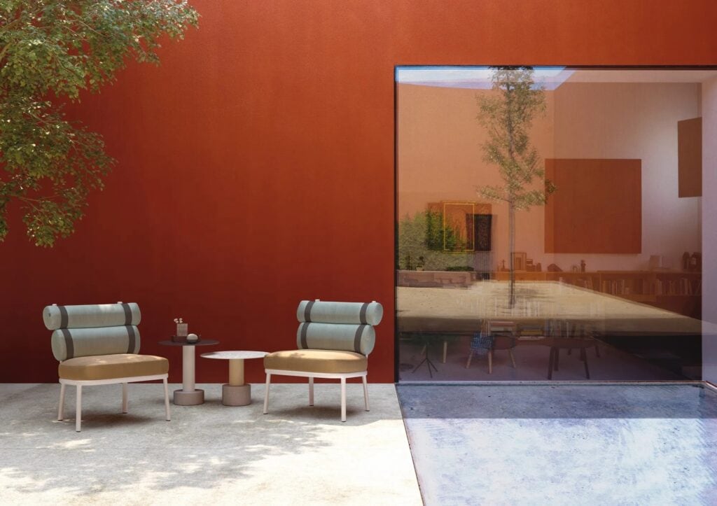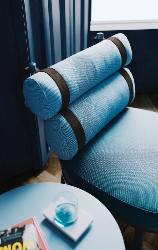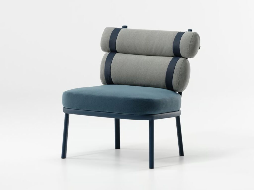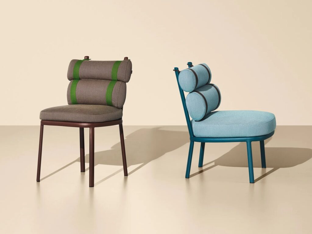 Dieses Modell interpretiert herkömmliche Polster mit einem Augenzwinkern und wartet anstelle einer normalen Rückenlehne mit zwei separaten Polsterrollen auf, die durch farbenfrohe Stoffstreifen miteinander verbunden sind.