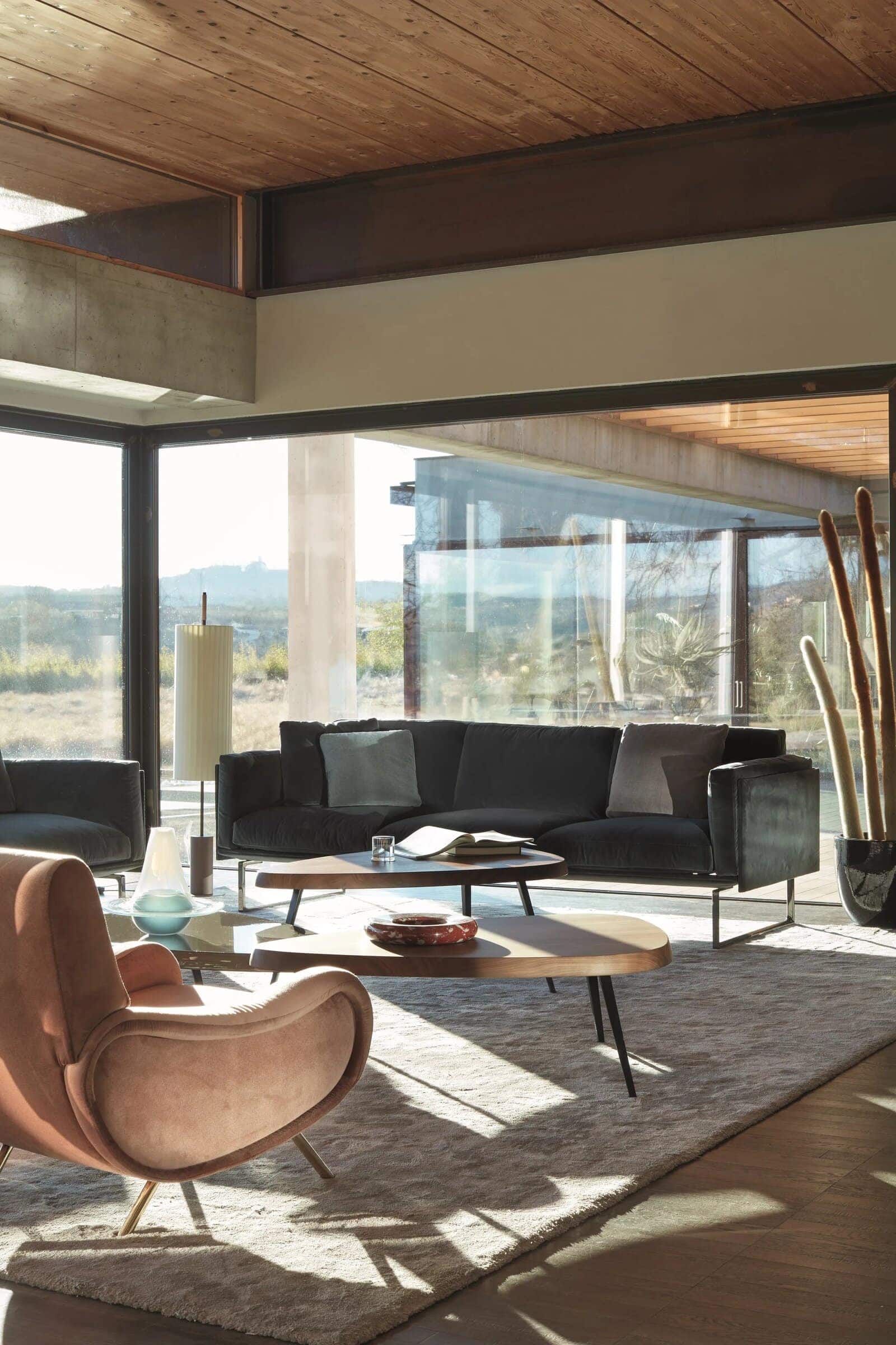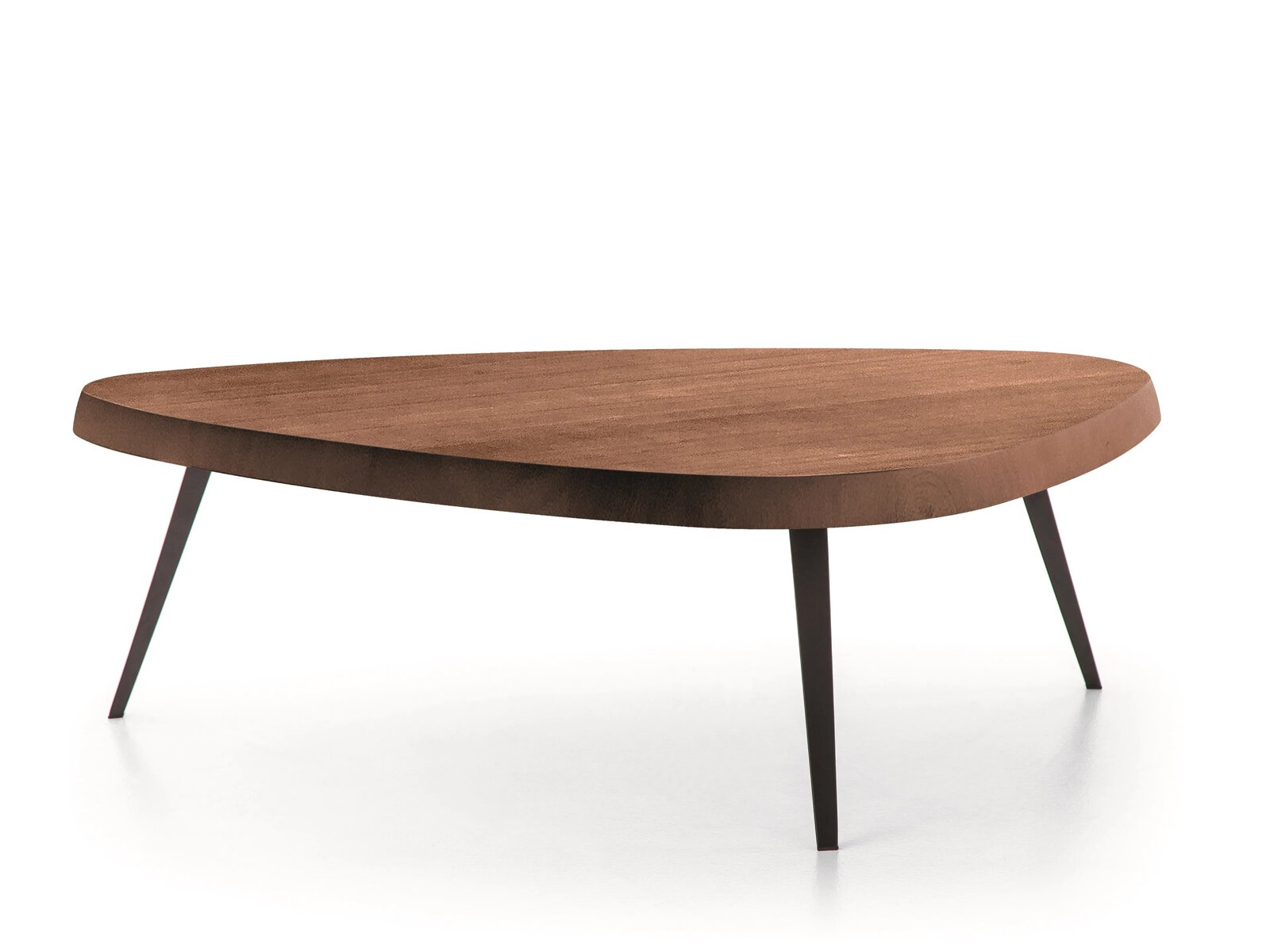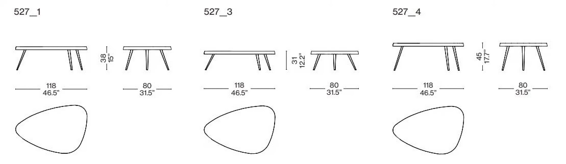 Gehört zu den Tischen en forme libre, die zwischen 1938 und 1939 entwickelt wurden. Das abschliessende Projekt wurde 1952 für die Zimmer der Studenten der Maison du Mexique in der Cité Universitaire Internationale von Paris konzipiert. Die Struktur, die dazu ausgelegt ist, so wenig Platz wie möglich einzunehmen, sah die Möglichkeit vor, mehrere Stücke nebeneinander aufzustellen, um grössere und regelmässige Kompositionen zu schaffen. 1952 ersetzte die Autorin die Holzbeine durch Beine aus gebogenem Blech mit dreieckigem Querschnitt. 1956 wurde eine niedrige Version für die Galerie Steph Simon in Paris geschaffen. Die grosse Dicke der Holzplatte, die sowohl aus Massivholz als auch mit glänzender oder matter Lackierung verfügbar ist, vermittelt immense Schönheit, während die Ränder ein Profil preisgeben, das perfekt die Form und Grösse der Hand hat. 2018 kommen zwei neue Esstisch-Varianten hinzu, die 5 oder 6 Personen Platz bieten können. Überdies wurden neue Finish-Lösungen eingeführt, die die Kombinierbarkeit und Funktionalität der Tische noch weiter erhöhen.