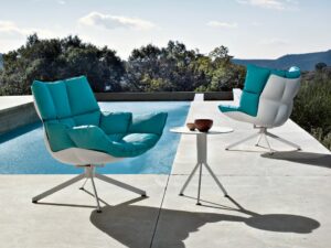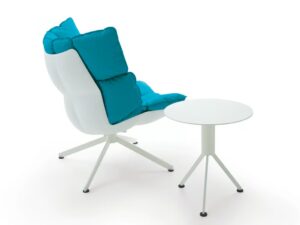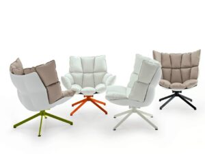Husk Outdoor besteht aus einer festen schale aus Hirek® und einer reihe weicher kissen. Die schale ist weiss, das feste untergestell hingegen in den ausführungen lackiert in fünf farben. Die kissen für sitzfläche und rückenlehne sind in zwei ausführungen erhältlich. Die wasserabweisenden bezüge aus technostoff gibt es in fünf farbvarianten.