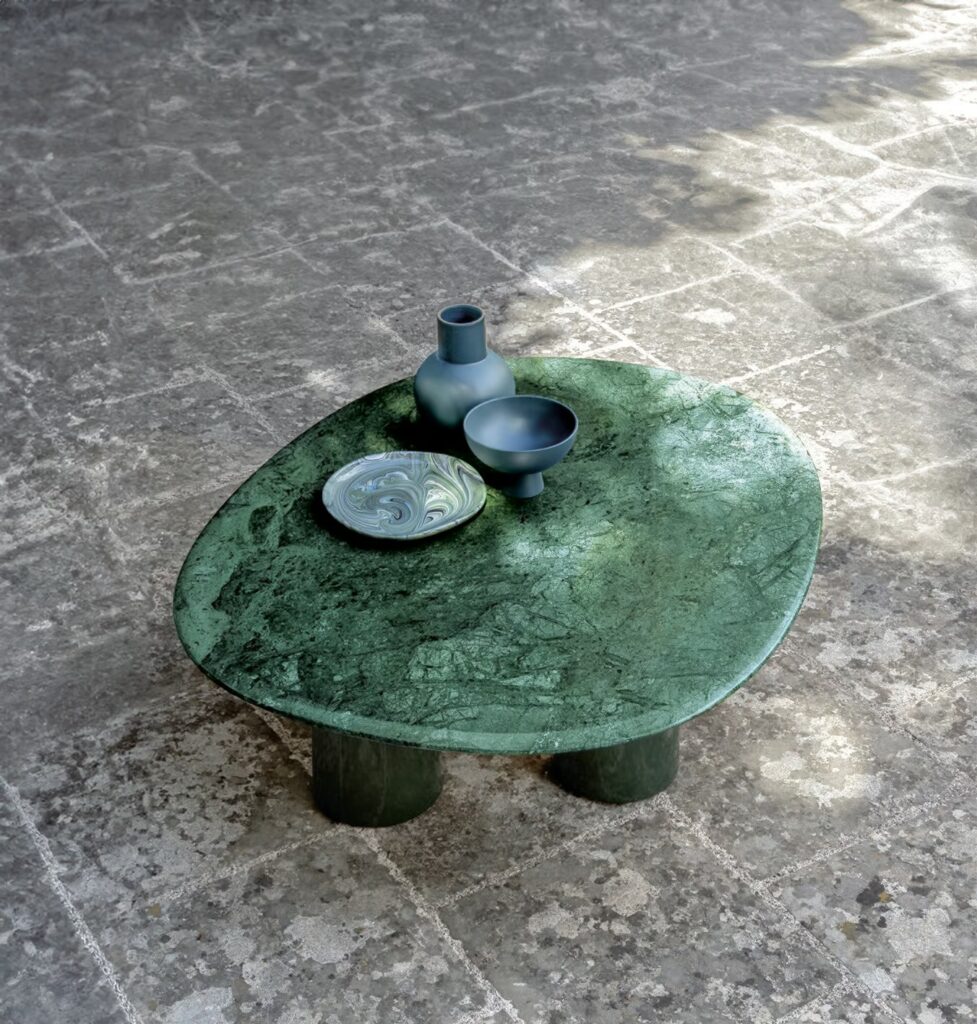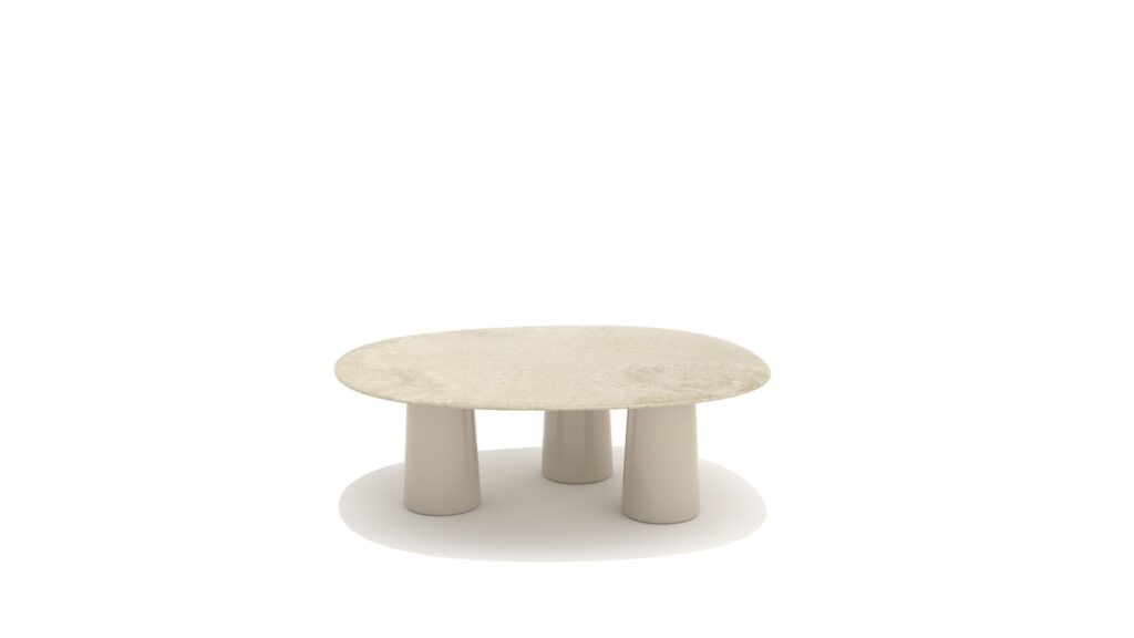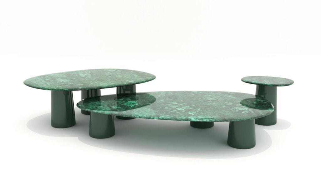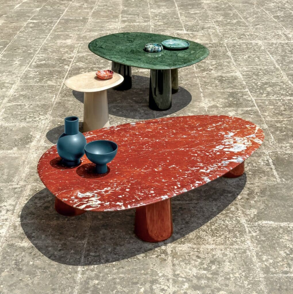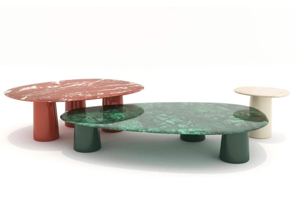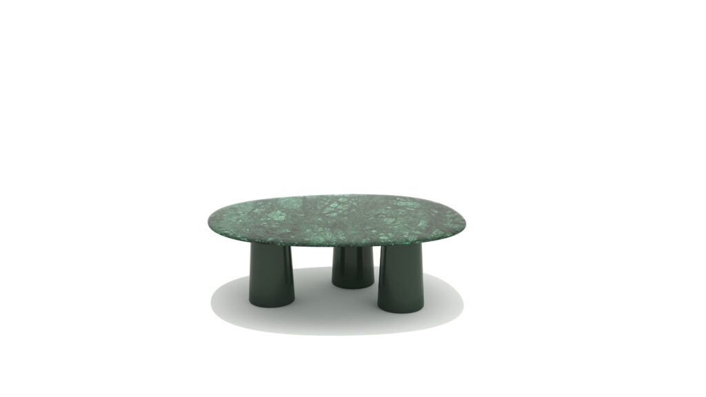 Die Tischplatten, erhältlich in drei ‚weichen‘ Formen (in den Formaten 160cm x 110cm H 38cm, 100cm x 100cm H 28cm und 38cm x 42cm H 28cm), sind in den Marmorsorten Rosso Francia, Verde Guatemala oder Travertin in der Farbgebung Sabbia erhältlich, mit einer glänzend polierten Oberfläche, die die Schönheit und die natürliche Maserung des Materials besonders zur Geltung bringt. In den Tischbeinen aus glasierter Keramik werden die Farben der Tischplatten und der Glanzeffekt wieder aufgegriffen, was dem Gesamtdesign Dynamik und Geschlossenheit verleiht.