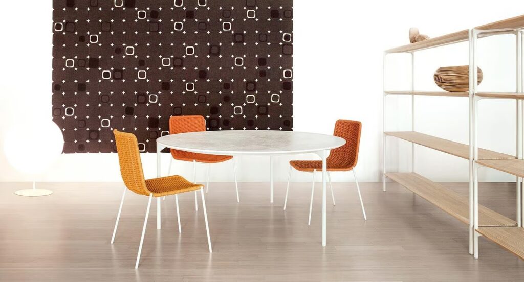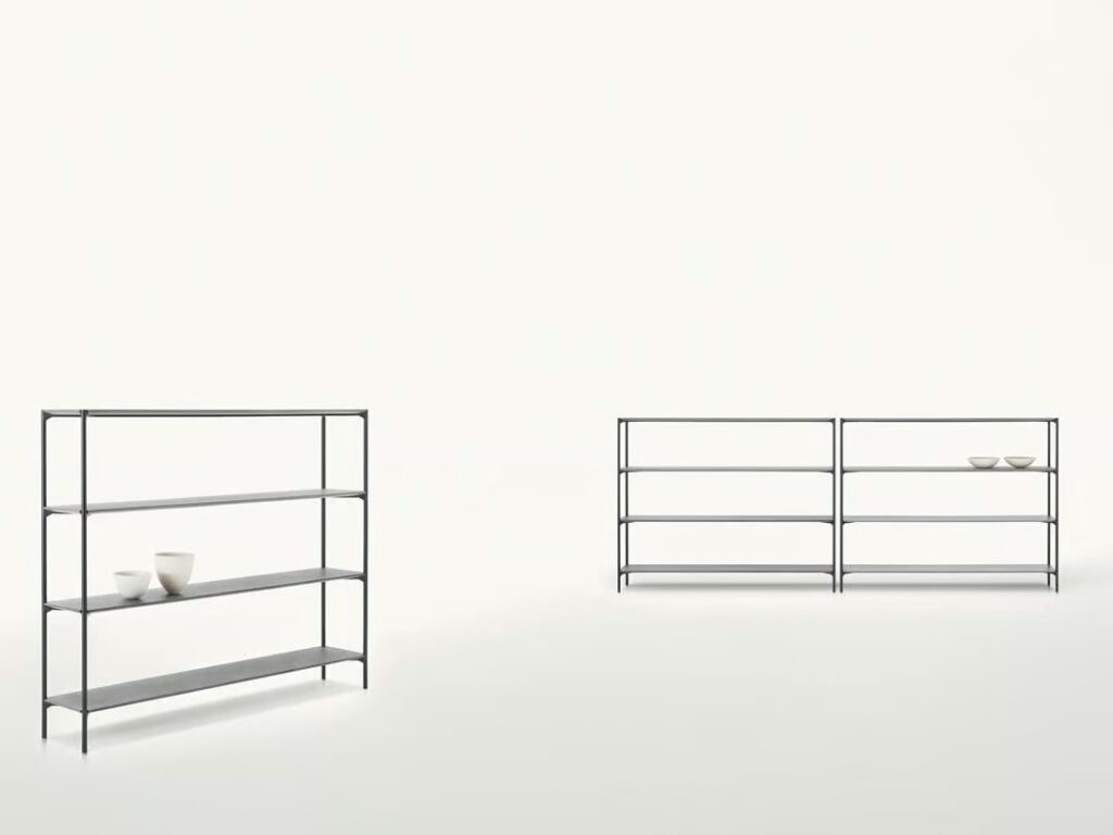 Bücherregale mit Struktur aus kataphoresebehandeltem und lackiertem Stahl in den Farben avorio oder grafite, Abstandshalter aus Kunststoff. Regale aus Leichtbeton in den Farben Avorio oder Grafite, passend zur Struktur, oder aus Accoya ® Holz. Die Serie Plano umfasst auch einen Beistelltisch und Esstische, die in zwei Höhen erhältlich sind.