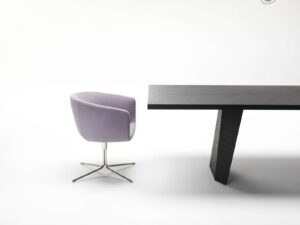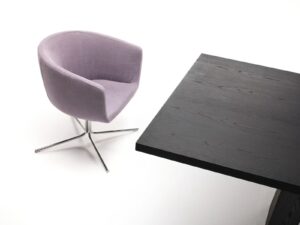 Bezug aus vernadeltem, geharztem Polyesterfaservlies, das auf einen Polyamidsamtrücken geklebt ist. Sitzkissen aus Polyurethanschaum, überzogen mit Acrylfaserschichten. Drehbares Gestell aus verchromtem Stahl oder aus grau-rotbraun lackiertem Stahl.