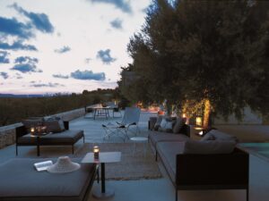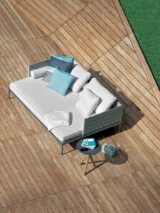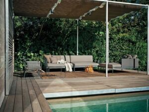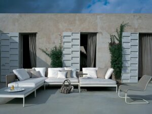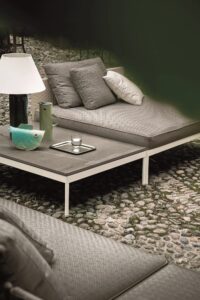 BASKET ist eine Kollektion mit extremer formaler Reinheit, die aus modularen Sofas und Couchtischen besteht, die den verfügbaren Raum optimal ausnutzen und ihn in eine einladende und anspruchsvolle Wohnecke im Freien verwandeln.