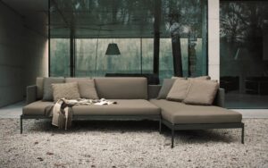 Die Kollektion BASKET besteht aus modularen Sofas, die aus einem in vier Größen erhältlichen Sockel bestehen, der allein, als Ottomane oder in Kombination mit geradlinigen oder eckigen Rückenlehnen verwendet werden kann, um vielfältige Kombinationen zu schaffen. Die Solidität der Struktur und das schlichte Design der Rückenlehnen aus verflochtenen Gurten bewahren ihr schlankes Aussehen, das durch den Komfort der äußerst bequemen Kissen ausgeglichen wird.
