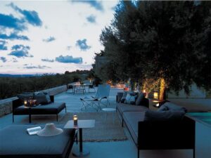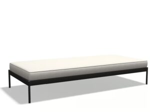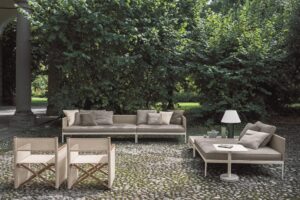 Die Verflechtung der Stoffe, das Netz der Garne und der Strick der Polsterung, der das Metallrohr in einer strengen und formalen Kombination umschmeichelt, definieren die Oberflächen, die die Vertikalität und Horizontalität dieser Kollektion klar umreißen, die geschaffen wurde, um Designmöbel, auch für den Außenbereich, zu schaffen.