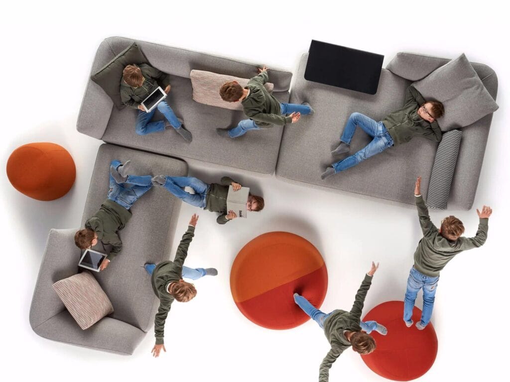 Polstermöbelsystem aus kombinierbaren Modulen mit Sitzelementen verschiedener Länge und Tiefe, Rückenlehnen in verschiedenen Höhen, Beistelltischen und Zusatzkissen.