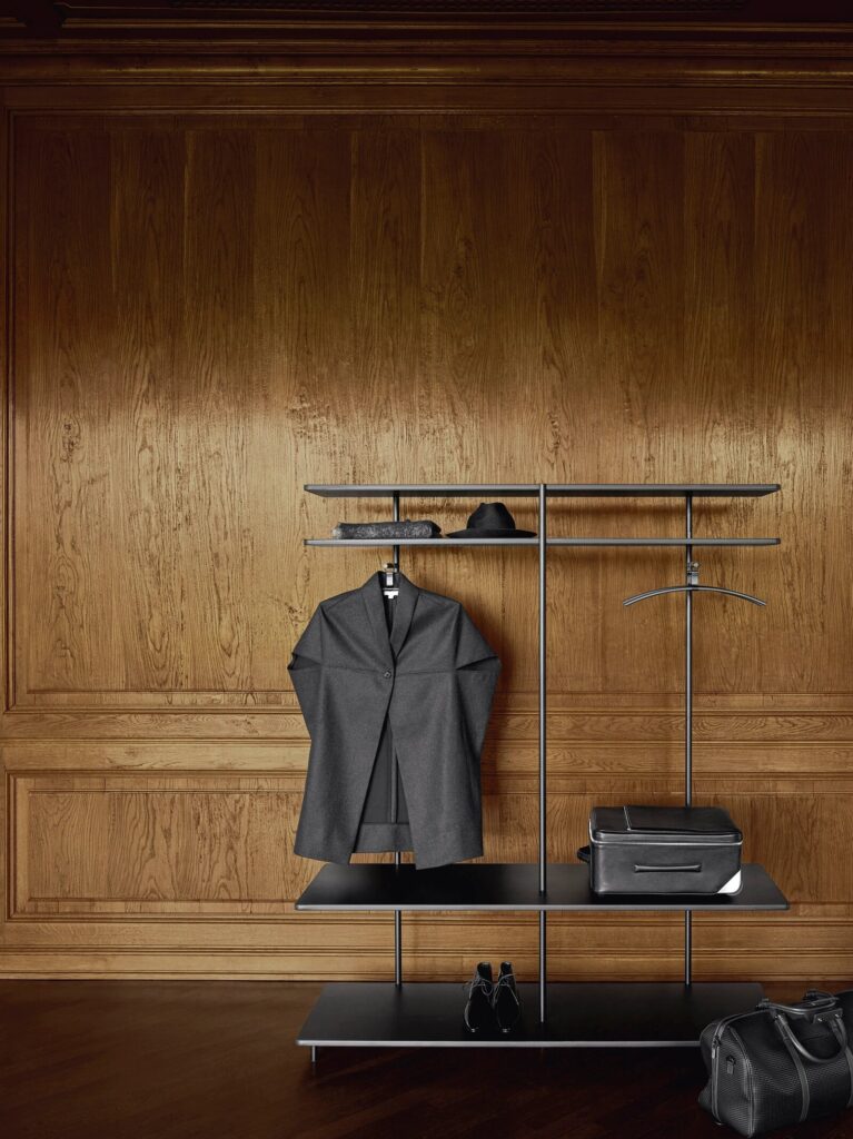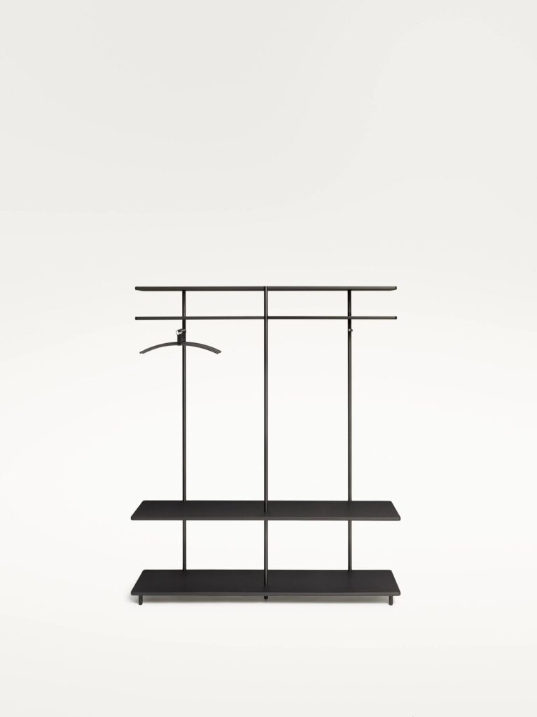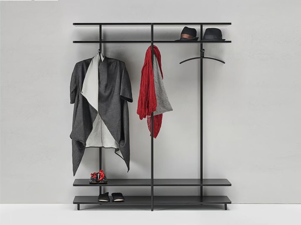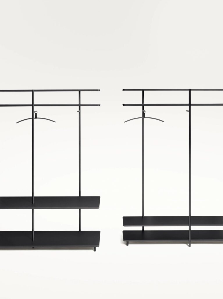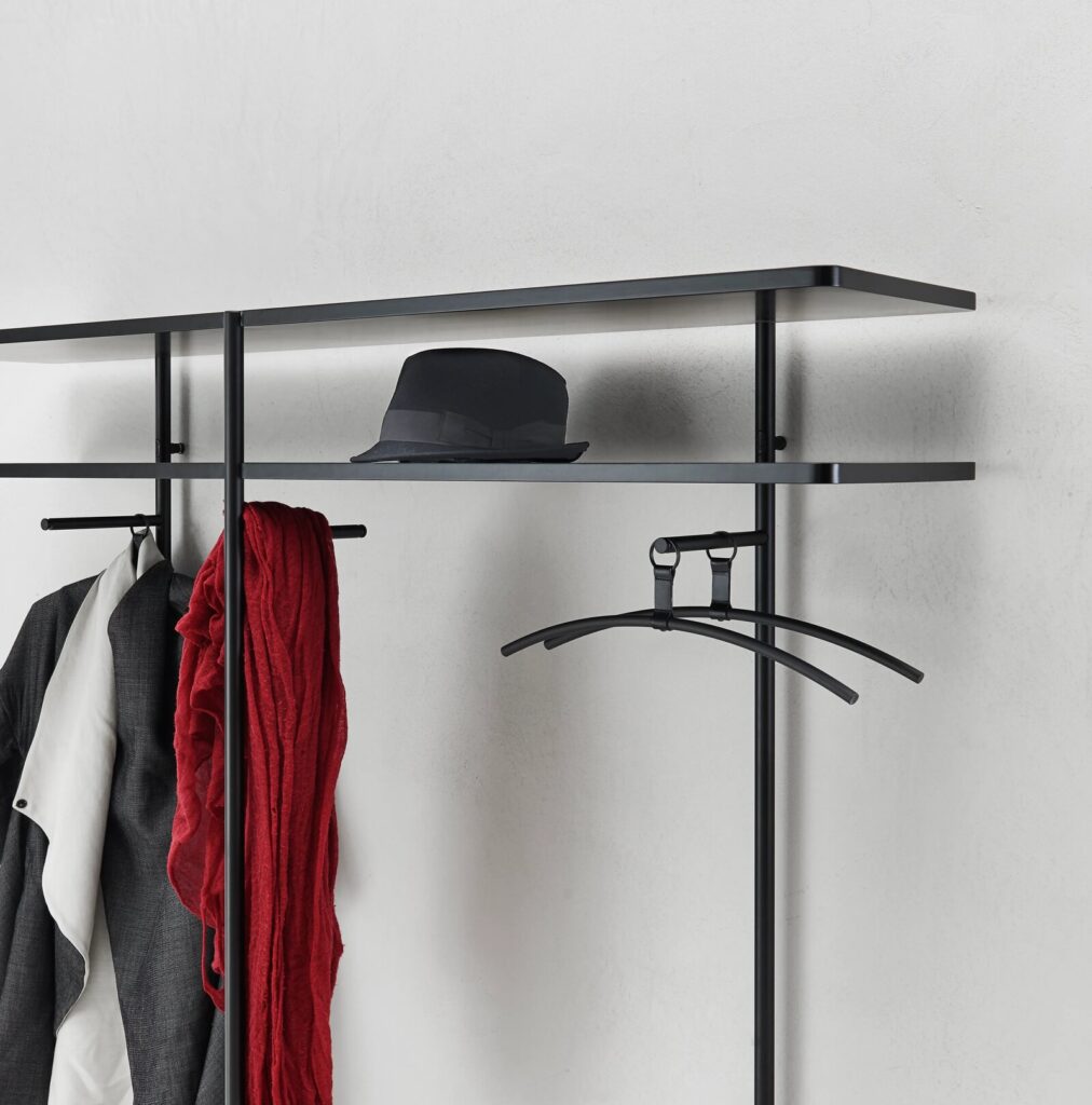 AERO V ist der "an der Wand befestigte" Kleiderständer, der mit unteren Ablagen in zwei verschiedenen Tiefen (32 cm oder 48 cm) und mit Ablagen in zwei verschiedenen Ausführungen erhältlich ist: