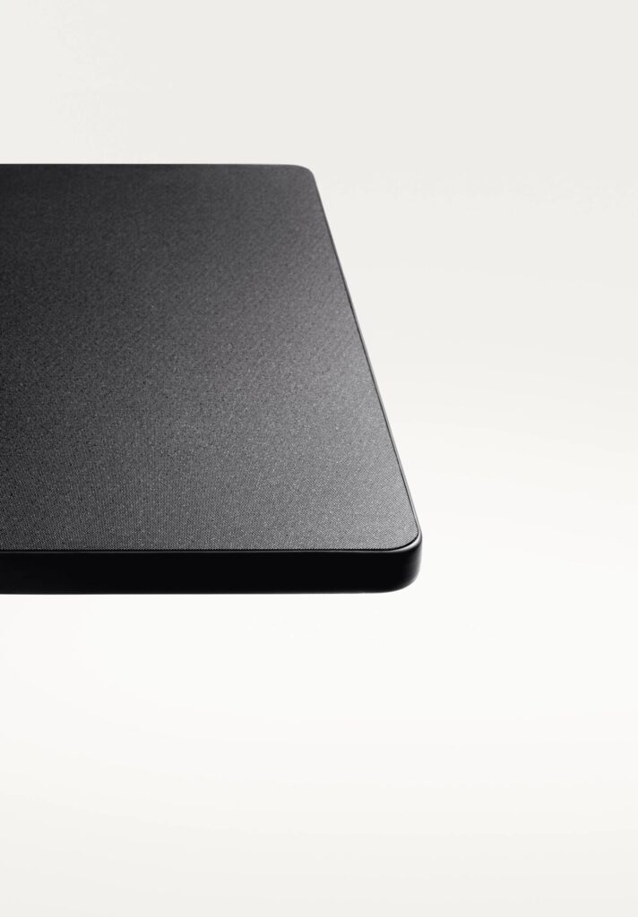 Alle Ausführungen der Regalböden sind mit Löchern und Durchführungen für die Befestigung der Pfosten versehen. Version "Laminat" mit oberen und unteren Regalböden (in beiden Tiefen) in "Sandwich" aus MDF und Aluminiumblech, eingefasst in zwei Laminatplatten mit geprägter Oberfläche und umlaufenden Kanten aus schwarzem thermoplastischem Material. Die Regalböden sind mit Löchern und Buchsen versehen, um die Befestigung der Pfosten