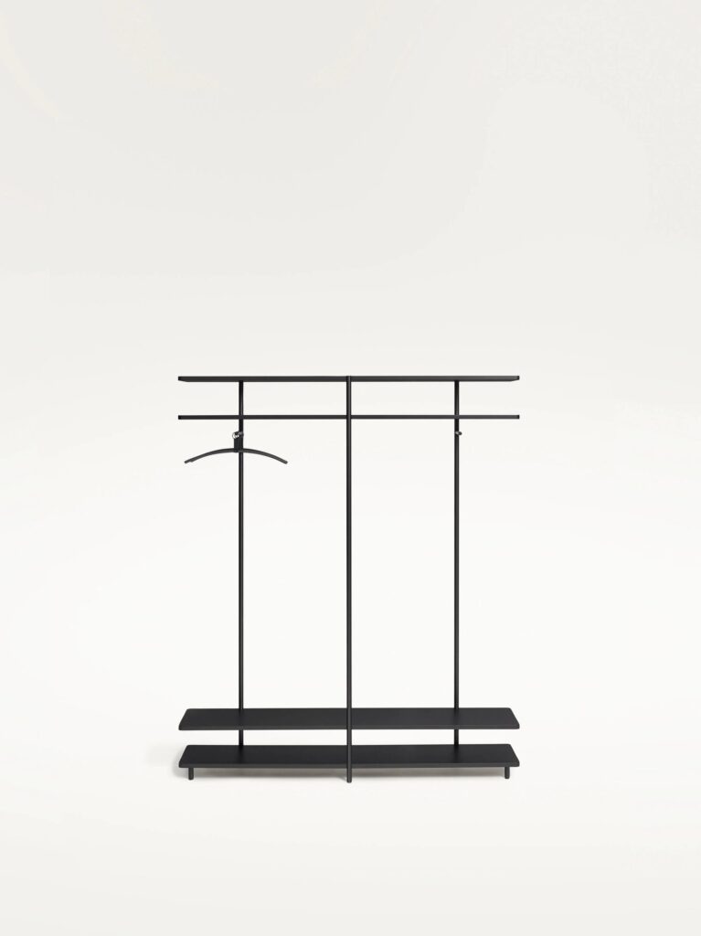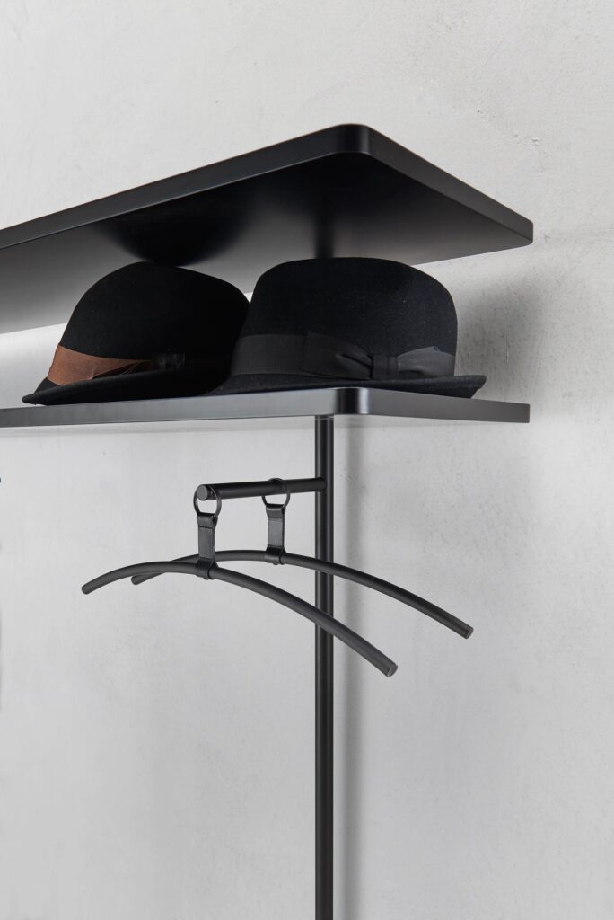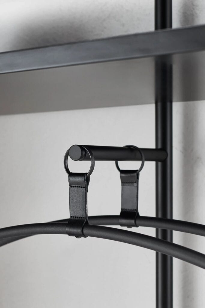 Ø16 mm, die an den Pfosten befestigt und in der jeweiligen Farbe lackiert sind. Kleiderbügel, bestehend aus einer kalandrierten Stahlstange mit Ø12 mm und einem Stahlring mit Ø35 mm, der mit Epoxidpulver schwarz oder gunmetalgrau lackiert und durch ein "Band" aus genähtem schwarzem Leder miteinander verbunden ist.