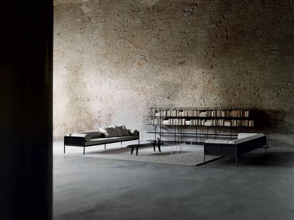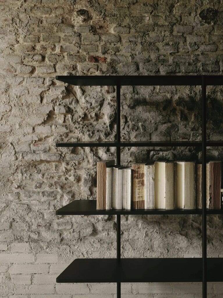 AERO ist das Bücherregal, das aus konturierten, doppelwandigen Regalböden mit einer Stärke von 18 mm besteht, die durch einen 7 cm hohen Rahmen aus massivem Buchenholz und Wabenplatten gebildet werden, der von zwei Aluminiumplatten umschlossen wird, die mit Löchern und Durchführungen für die Befestigung der Pfosten versehen sind. Flüssiglackierung RAL - K7 9010 weiss oder RAL-K7 9017 schwarz oder "Zementeffekt"-Lackierung