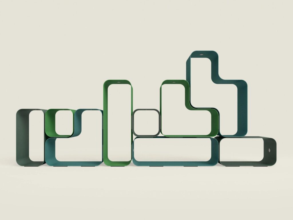 Rebus ist ein modulares Regalsystem aus 3 mm starkem, gefaltetem und lackiertem Metall. Die Module werden mit Hilfe eines magnetischen Befestigungssystems zusammengesetzt. Die Metallelemente, die in verschiedenen Formen und Grössen erhältlich sind, sind stapelbar und multidirektional.