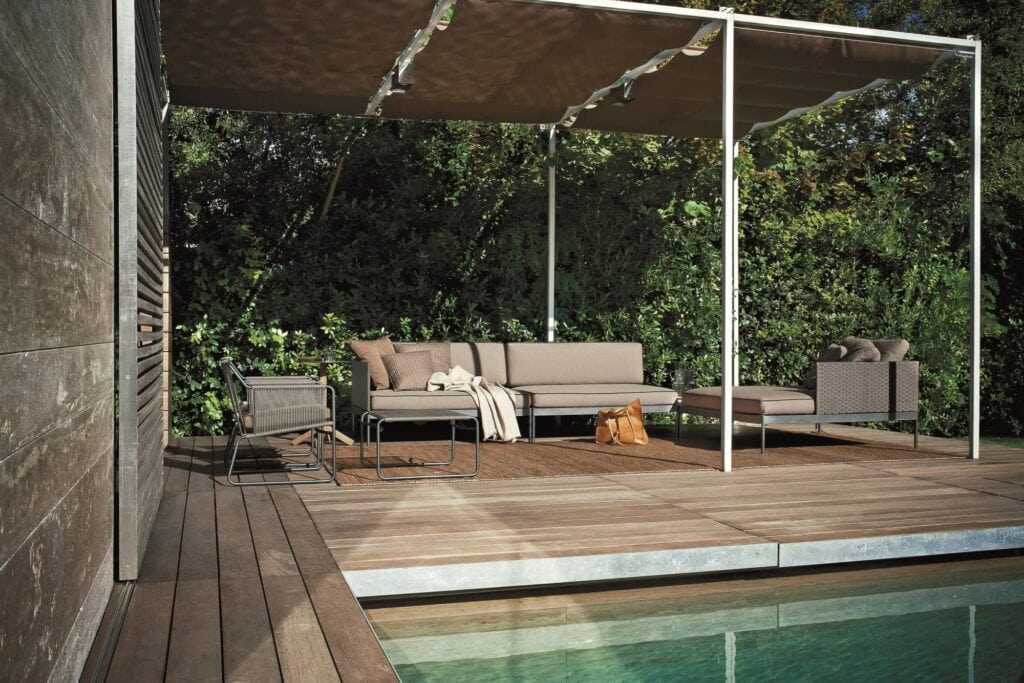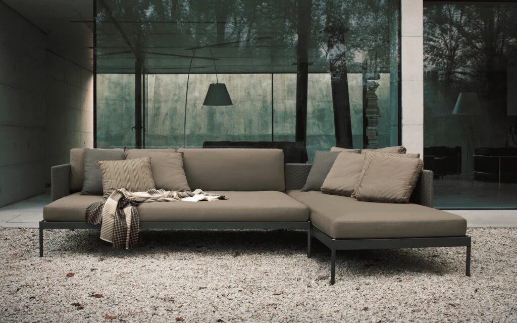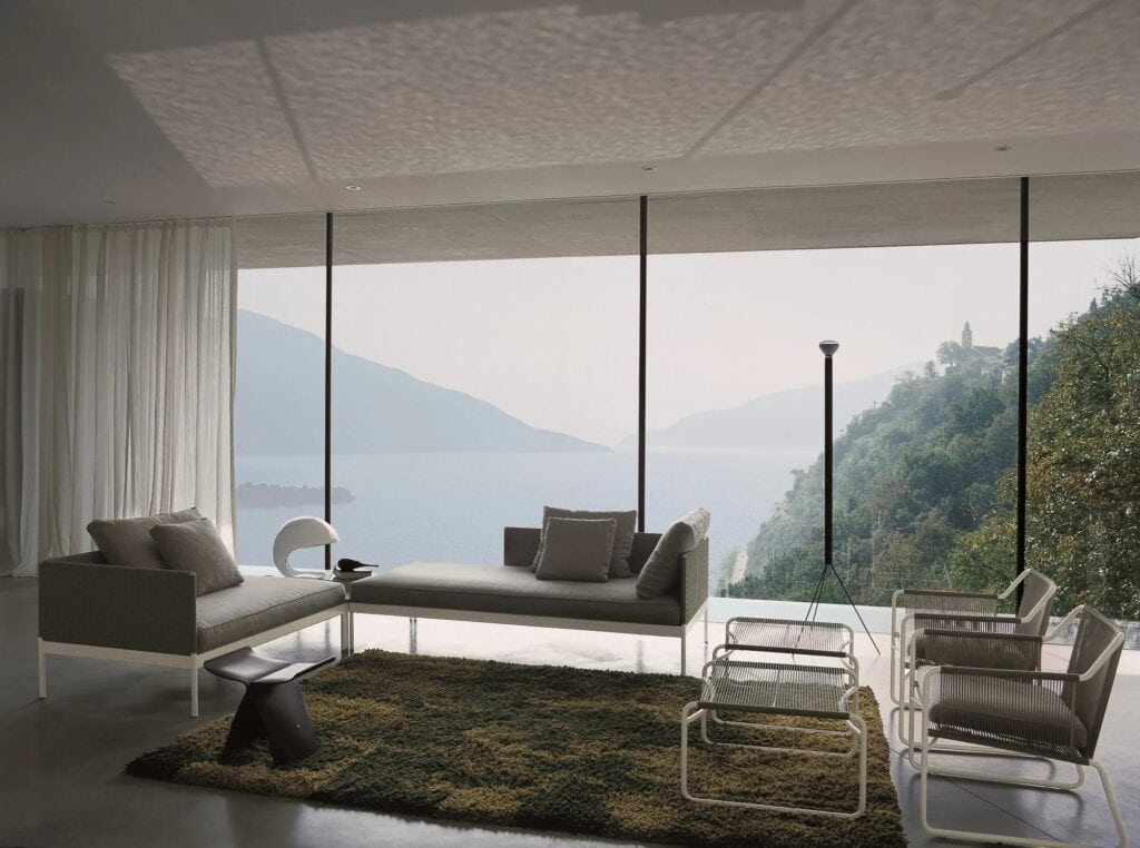 Die Verflechtung der Stoffe, das Netz der Garne und der Strick der Polsterung, der das Metallrohr in einer strengen und formalen Kombination umschmeichelt, definieren die Oberflächen, die die Vertikalität und Horizontalität dieser Kollektion klar umreißen, die geschaffen wurde, um Designmöbel, auch für den Außenbereich, zu schaffen.