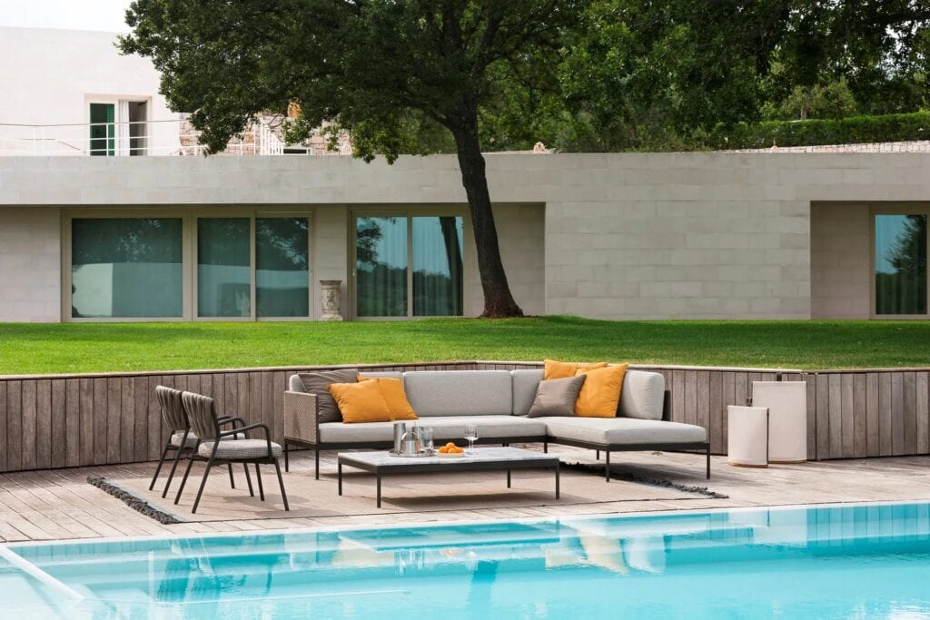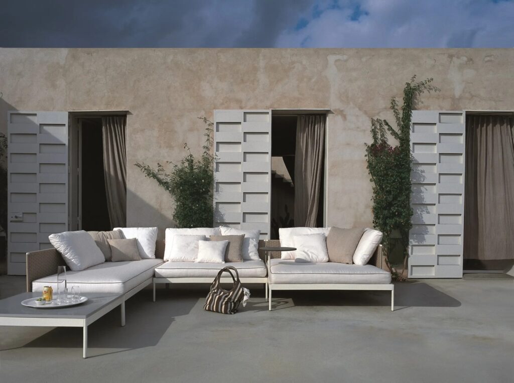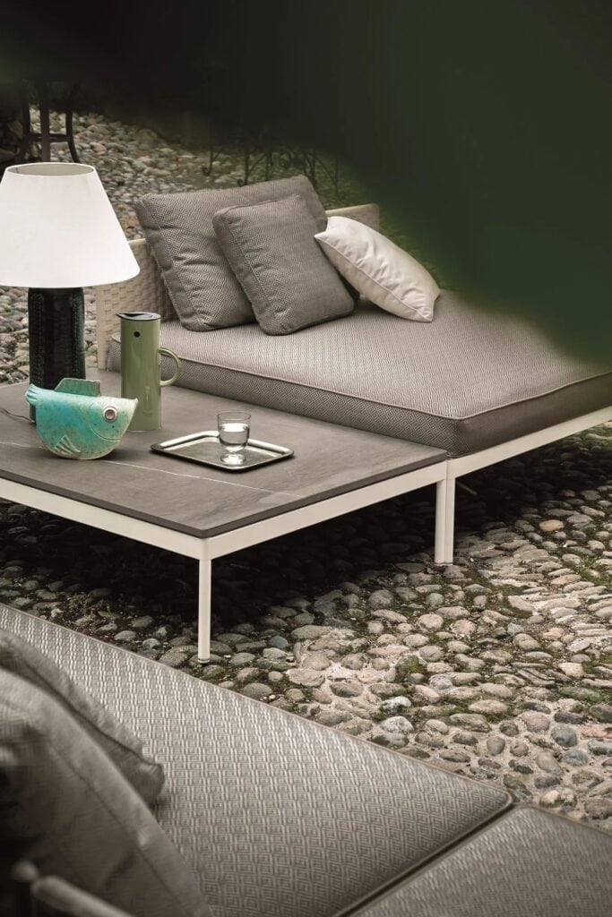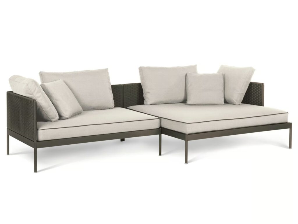BASKET ist eine Kollektion mit extremer formaler Reinheit, die aus modularen Sofas und Couchtischen besteht, die den verfügbaren Raum optimal ausnutzen und ihn in eine einladende und anspruchsvolle Wohnecke im Freien verwandeln.